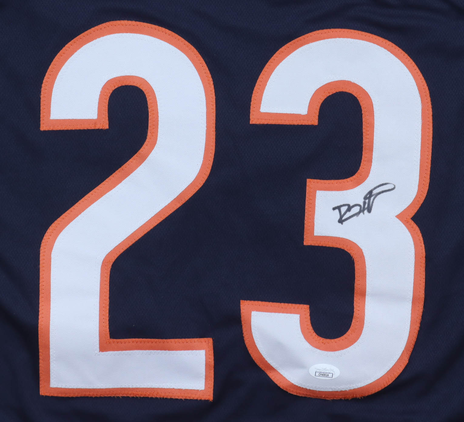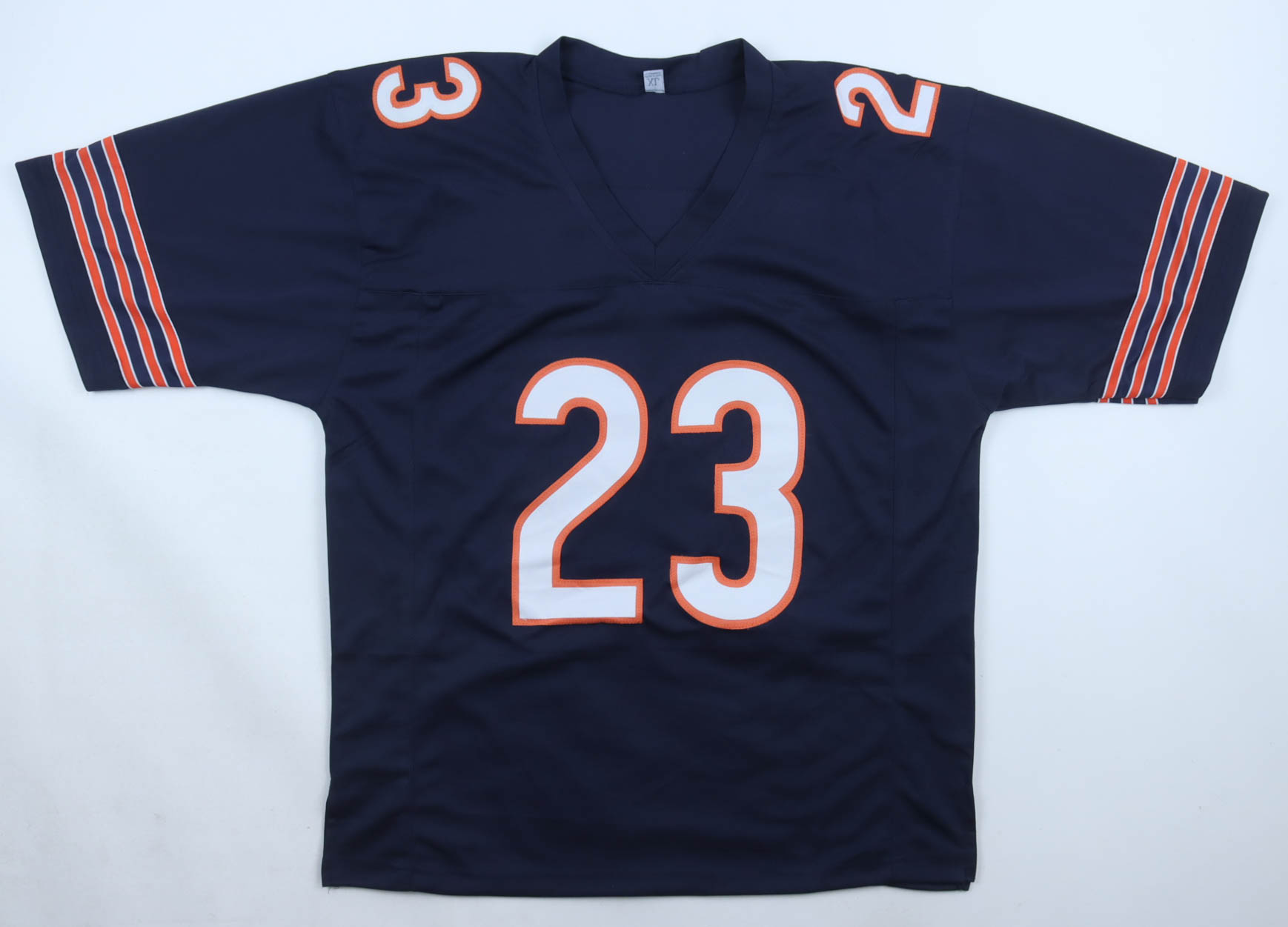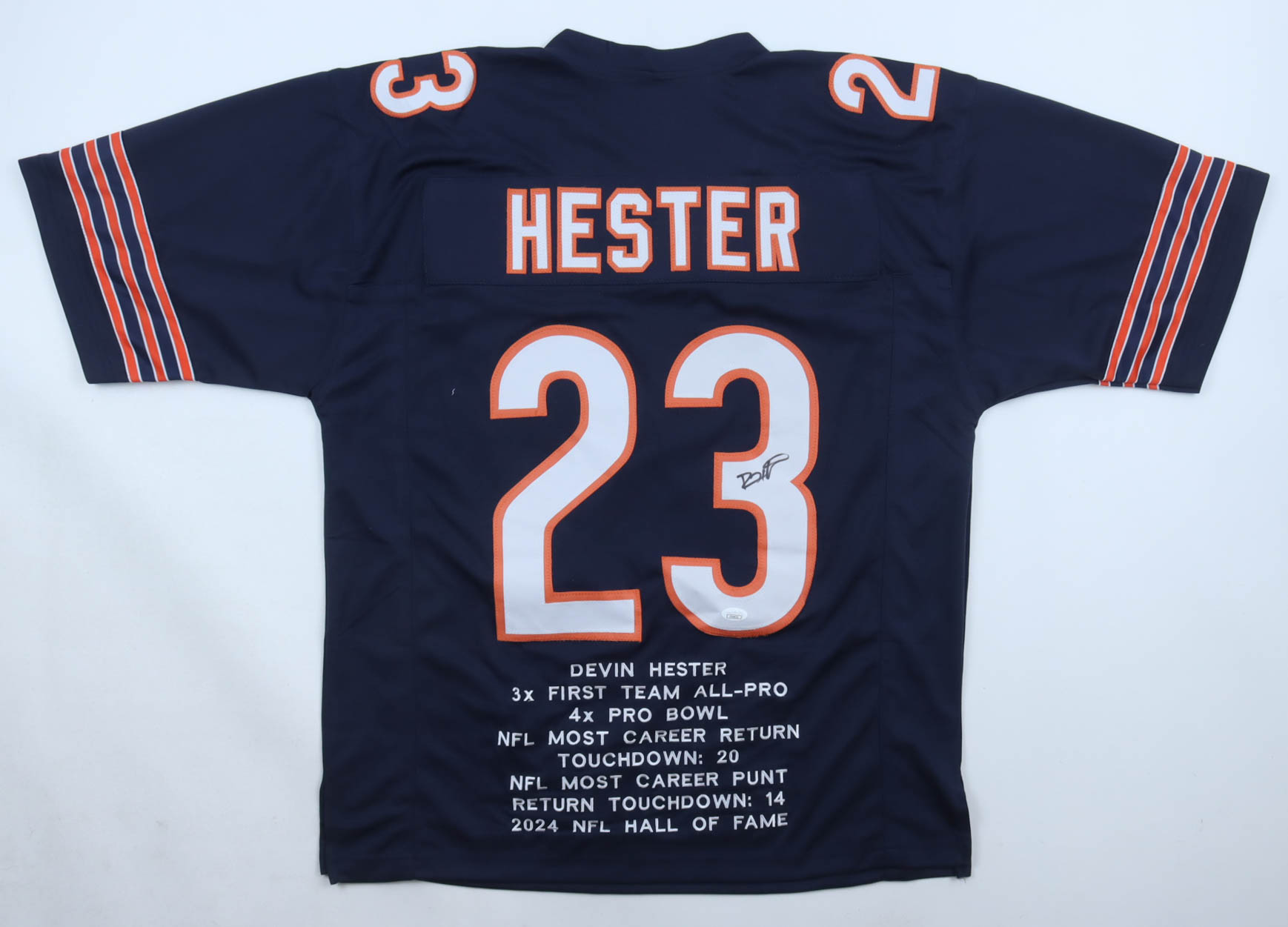 Custom jersey, everything sewn on, size XL, and has been hand-signed by Devin Hester (HOF). Hester's career highlight stats have been custom-stitched below the reverse number.