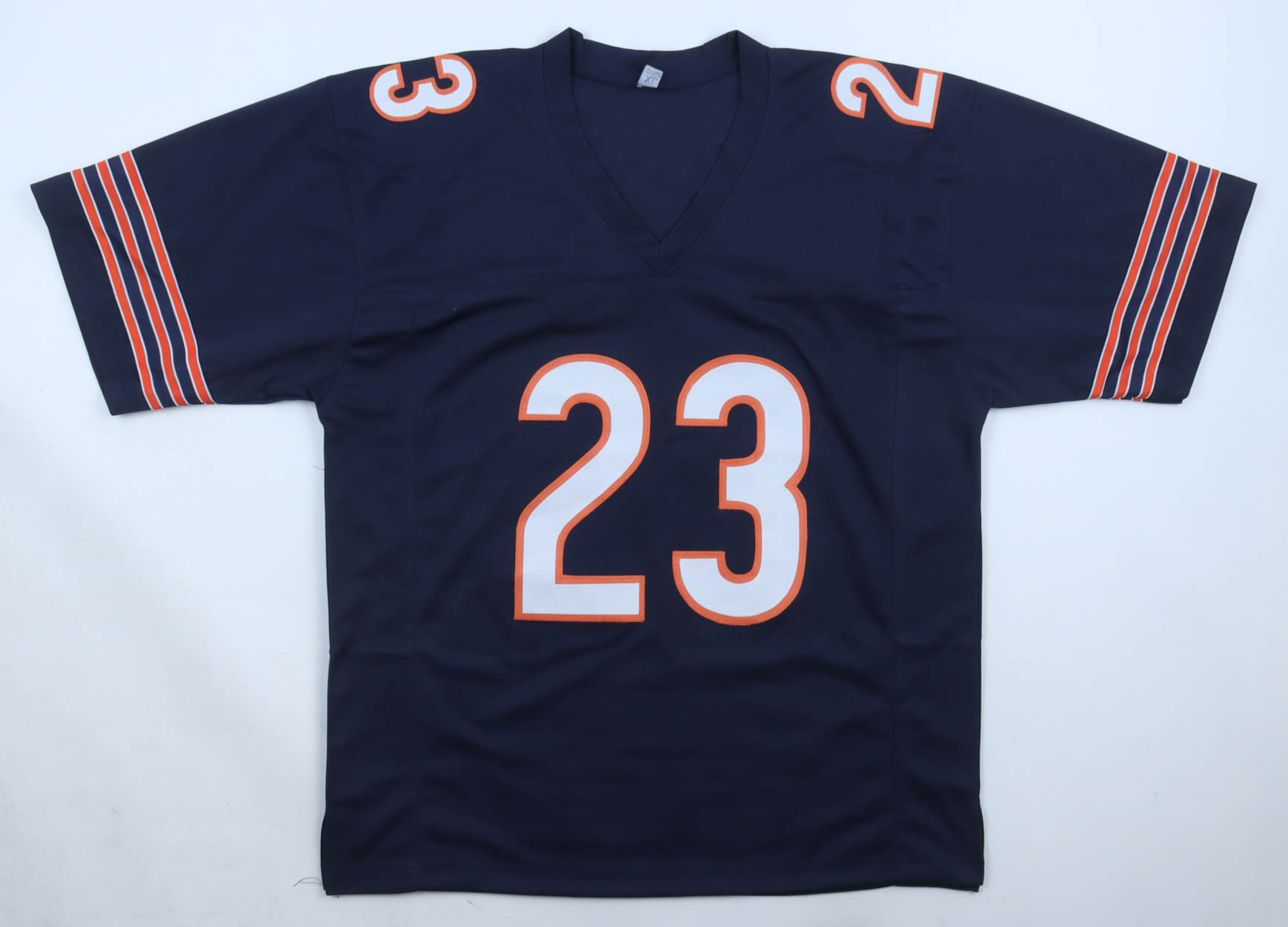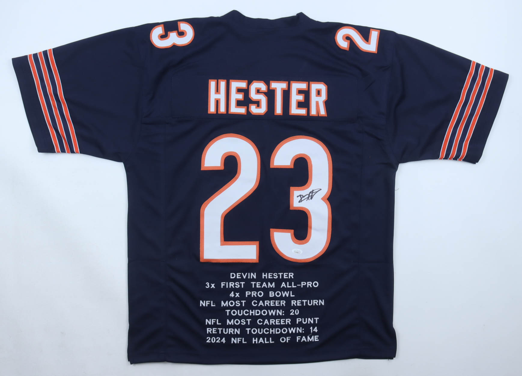 Custom jersey, everything sewn on, size XL, and has been hand-signed by Devin Hester (HOF). Hester's career highlight stats have been custom-stitched below the reverse number.