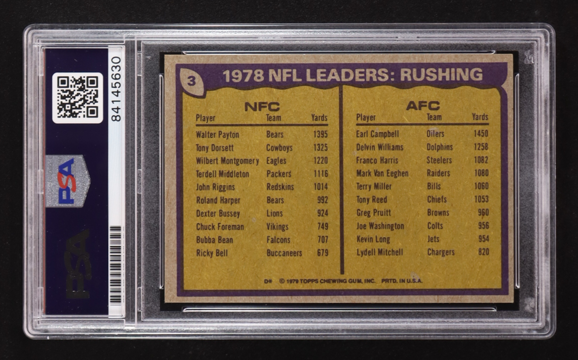 Earl Campbell RC / Walter Payton Signed 1979 Topps NFL Leaders Rushing #3 RC (PSA)