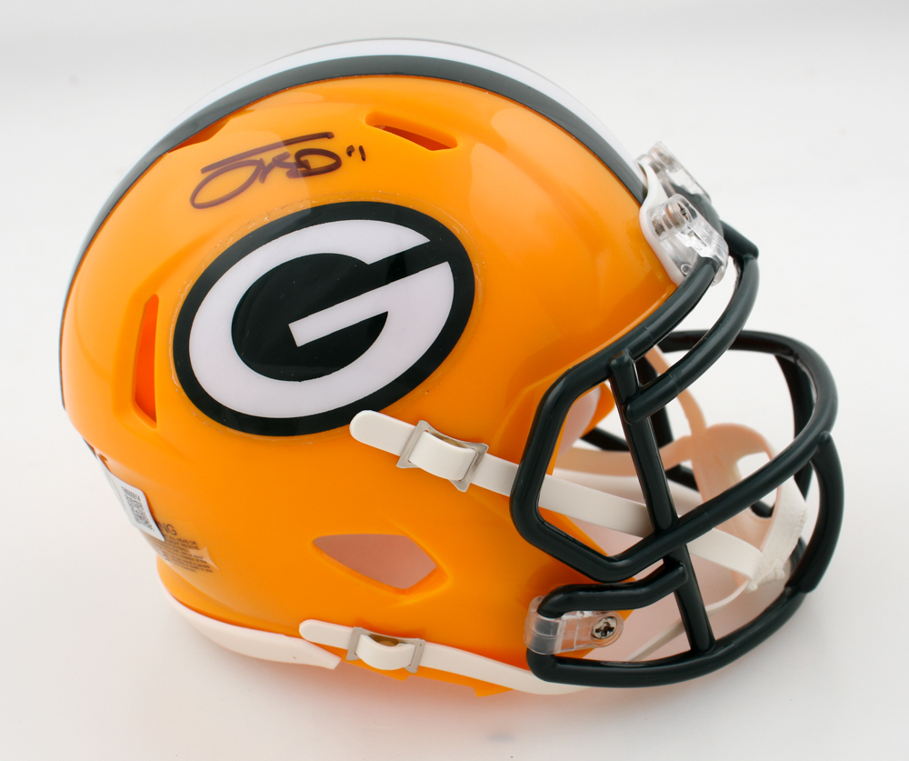 Riddell Green Bay Packers Speed mini helmet. Hand-signed by Jayden Reed.