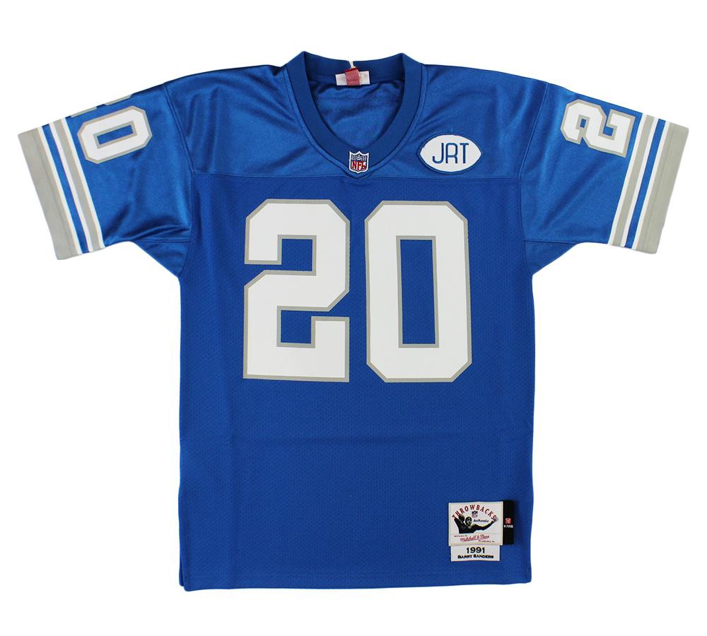 Mitchell & Ness jersey with everything pressed on, size M. Hand-signed by Barry Sanders (Detroit Lions, HOF).