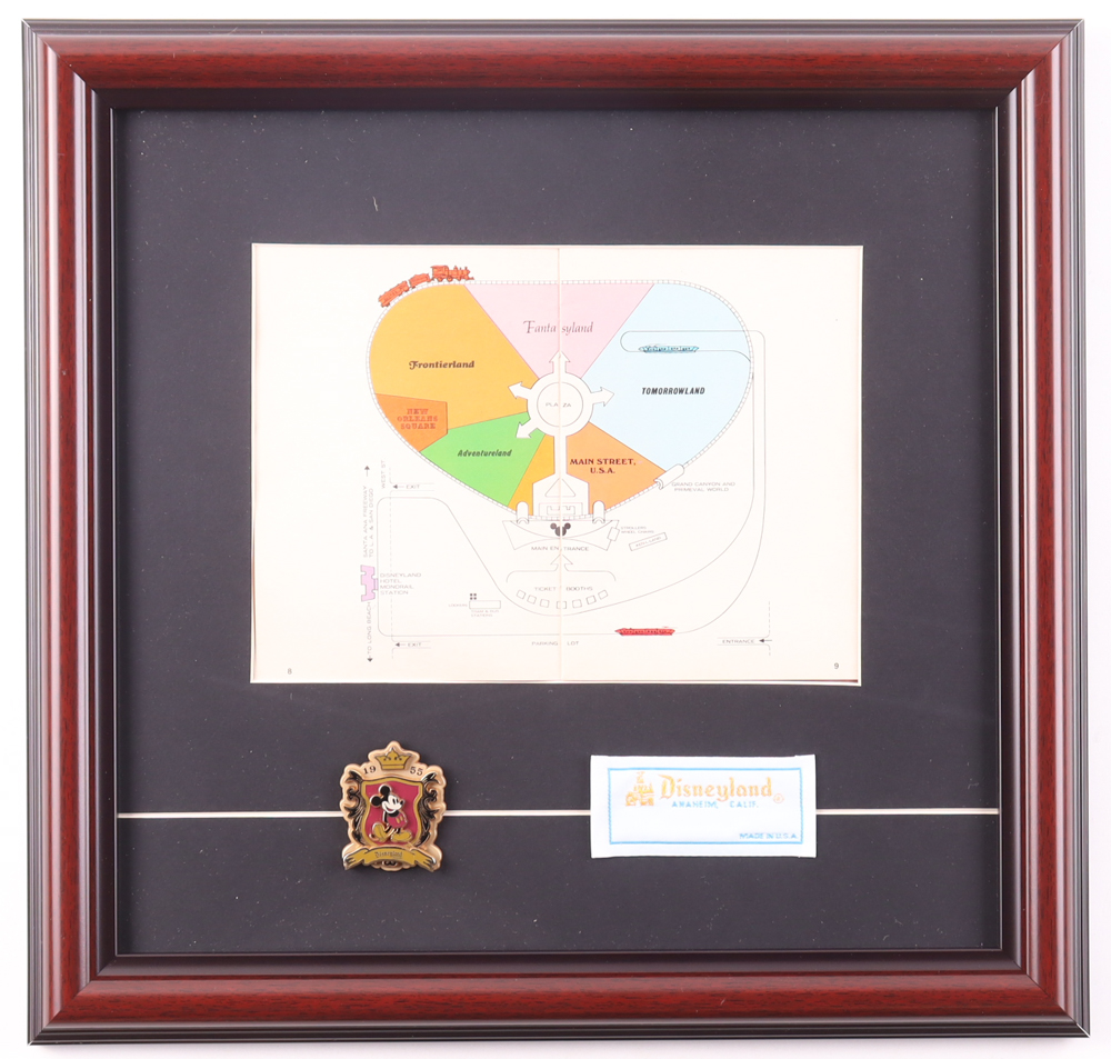 Custom frame measures approximately 13" x 14" in size. The display features a 1969 on-site vintage park map as well as a 1955 Disneyland pin and an original employee uniform tag. Note, the display is unsigned. Please see photos for details regarding the condition of the item.