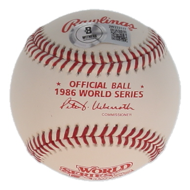 Rawlings Official 1986 World Series Baseball. Hand-signed and inscribed by Keith Hernandez (New York Mets). Please note, there are stains throughout the baseball.