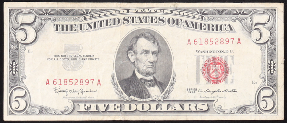 1963 U.S. $5 Legal Tender Note, Red Seal - Fr. 1536 (AA Bleck) Signed: Granahan / Dillon