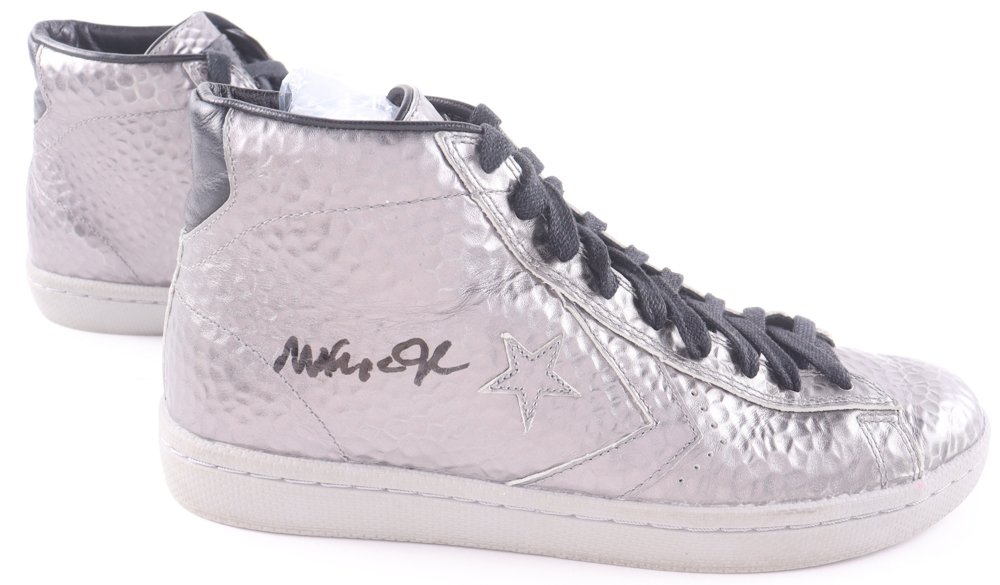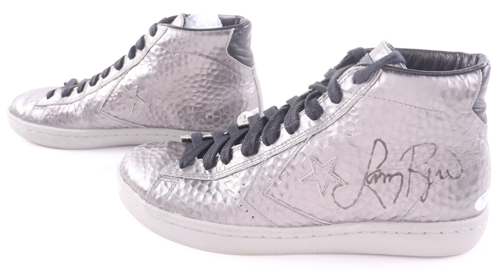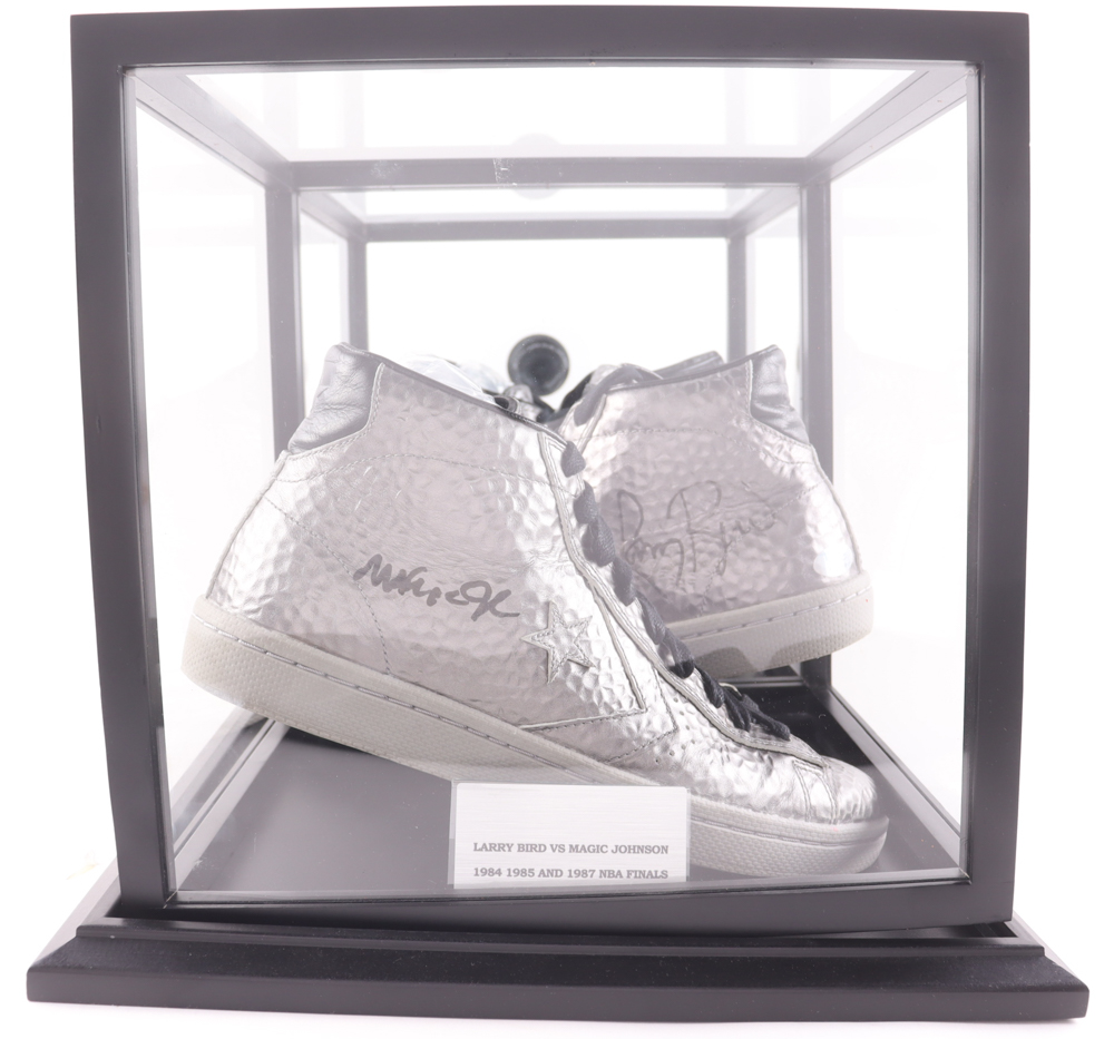 Pair of (2) Pro Leather "Hammered Metal" Basketball Shoes. Hand-signed by Magic Johnson (Los Angeles Lakers, HOF) and Larry Bird (Boston Celtics, HOF). Please refer to photos for more details. Display case is included as shown.