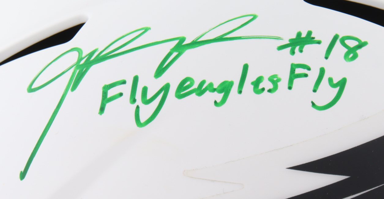 Riddell Philadelphia Eagles full-size Lunar Eclipse Alternate replica speed helmet has been hand-signed and inscribed by Jalen Reagor.