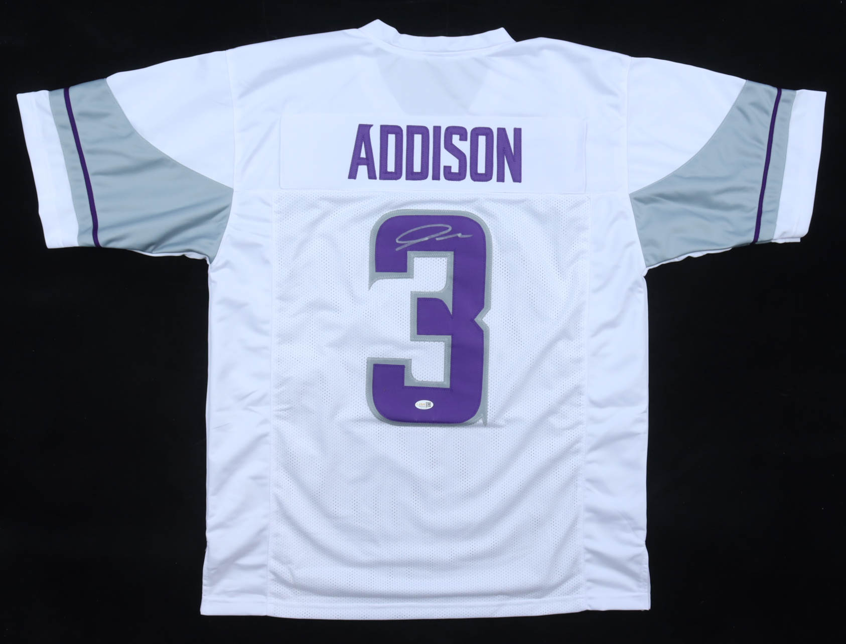 Custom jersey. Everything is sewn on, size XL. Hand-signed by Jordan Addison.