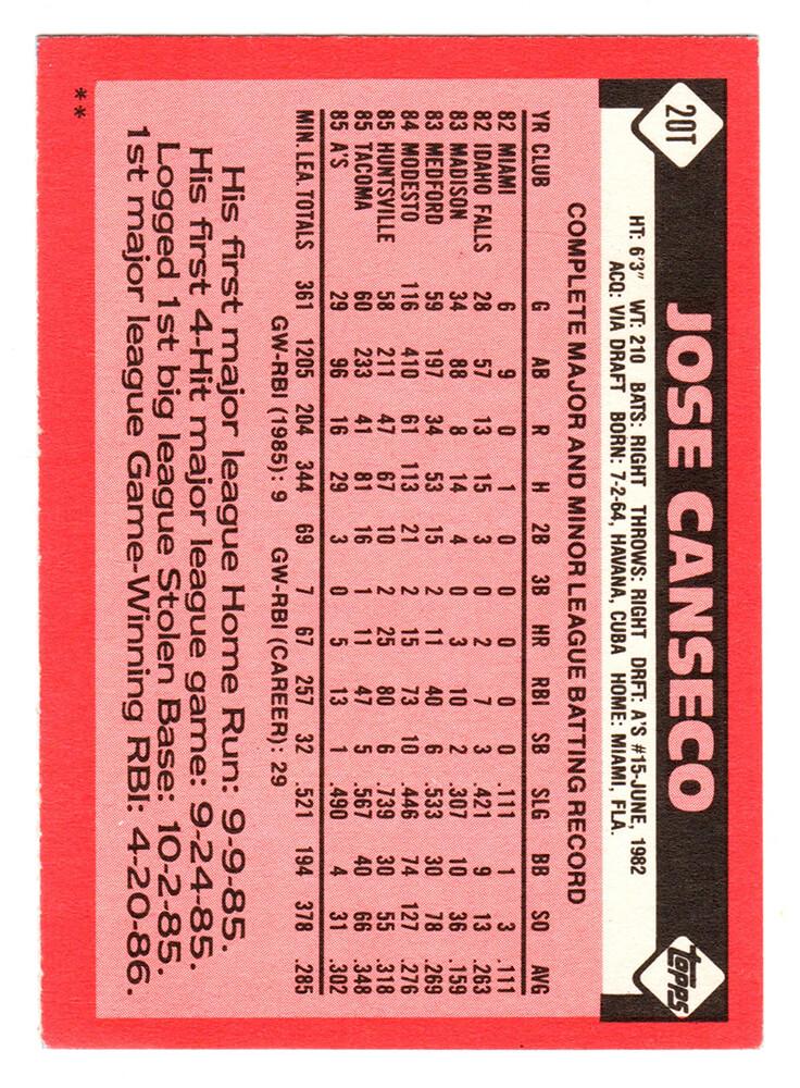 Jose Canseco Signed 1986 Topps #20T RC (Schwartz)