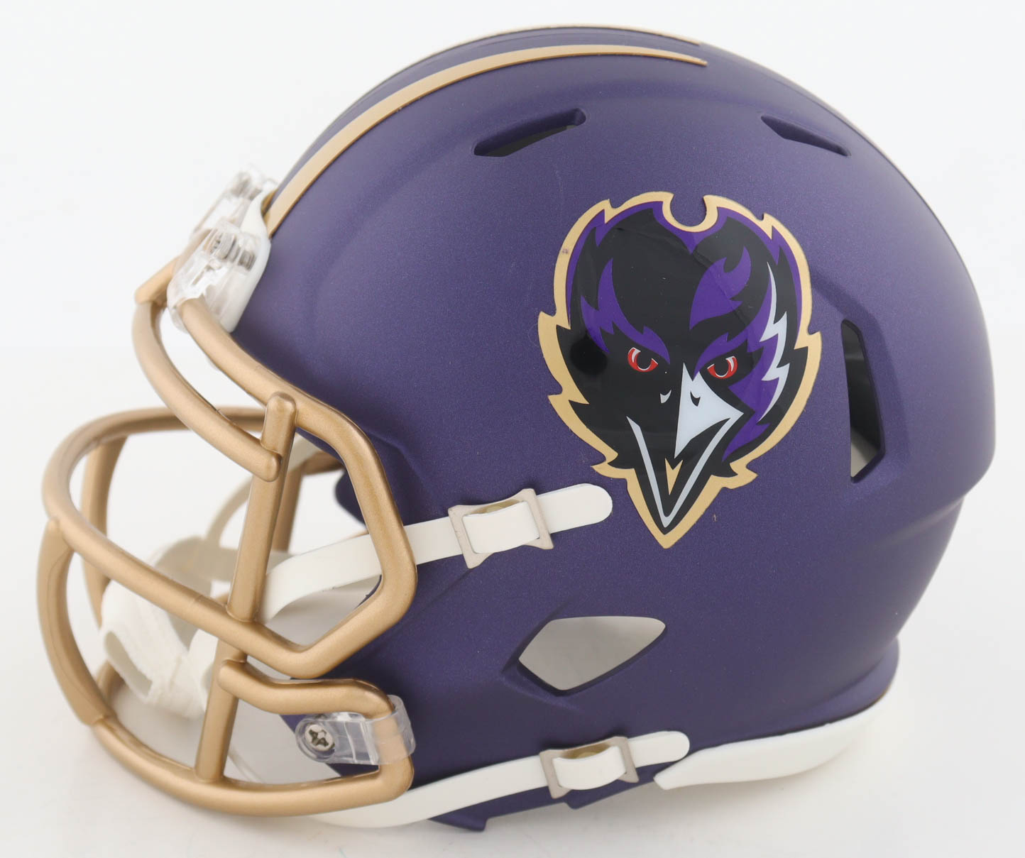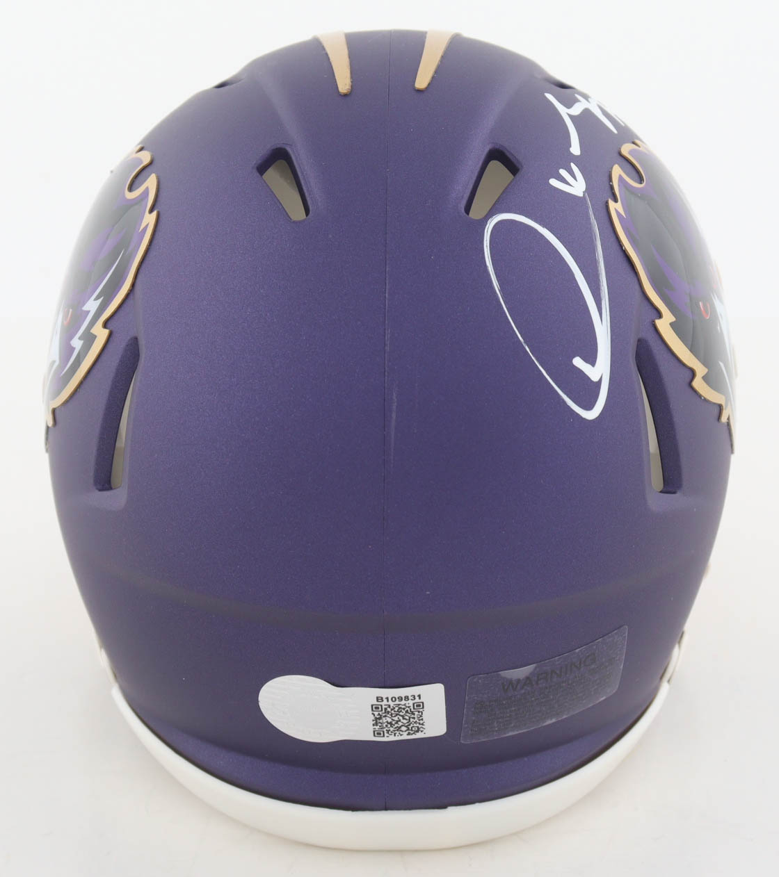 Riddell Baltimore Ravens 2024 Alternate Speed mini helmet has been hand-signed by Derrick Mason.