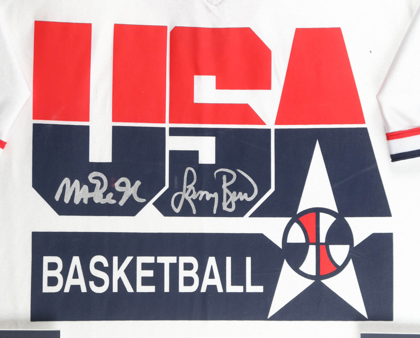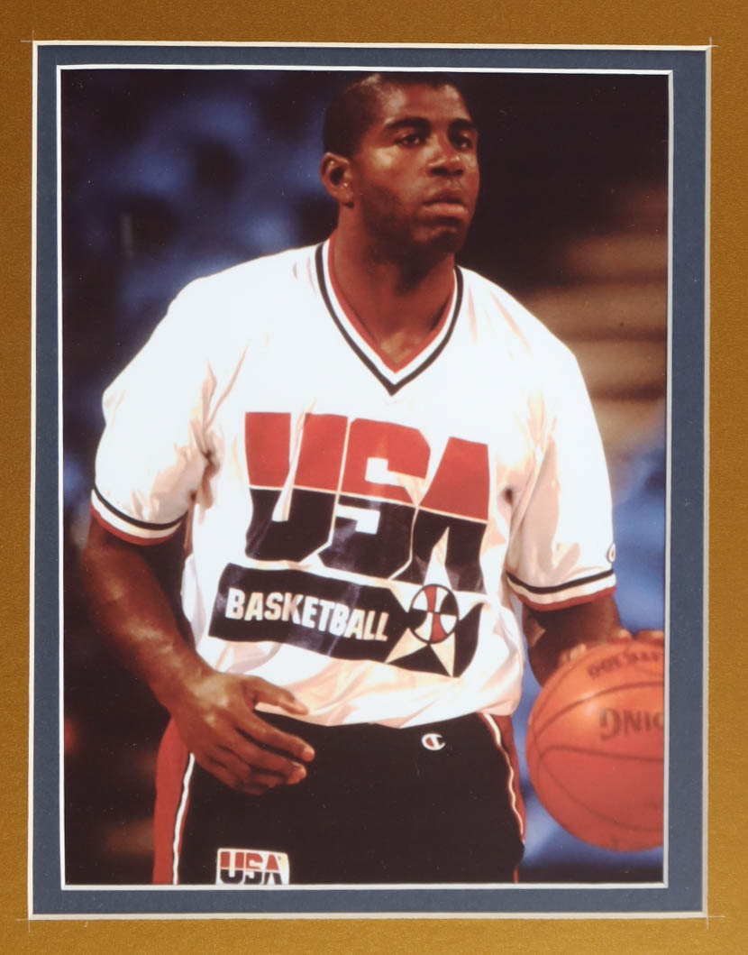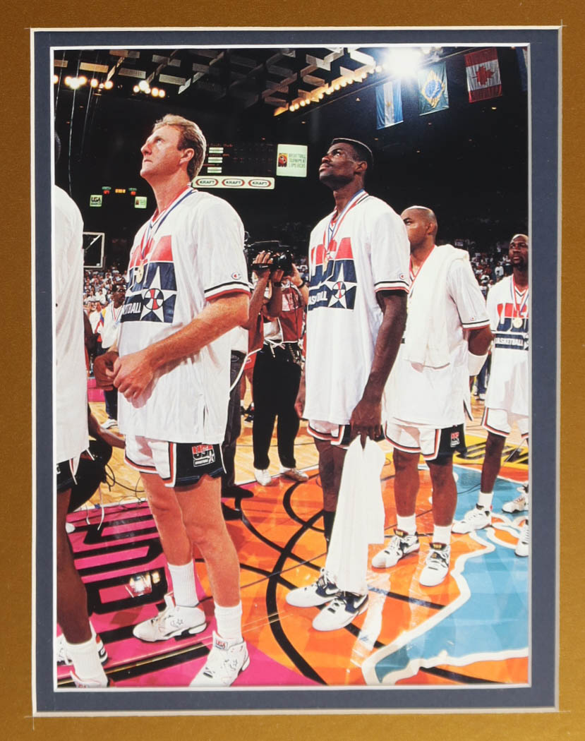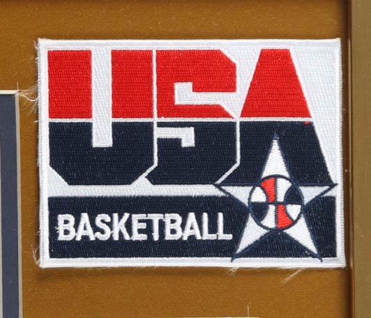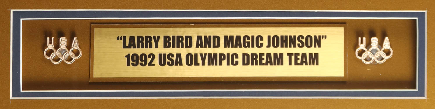 Custom frame measures approximately 32" x 36" in size and features a Team USA Authentic Mitchell and Ness warm-up shirt that has been hand-signed by Larry Bird (HOF) and Magic Johnson (HOF). The display also includes (2) 8" x 10" Photos, (2) Team Logo patches, (2) USA Olympic Team Pins and title plaque. Please note, the display is unsigned.