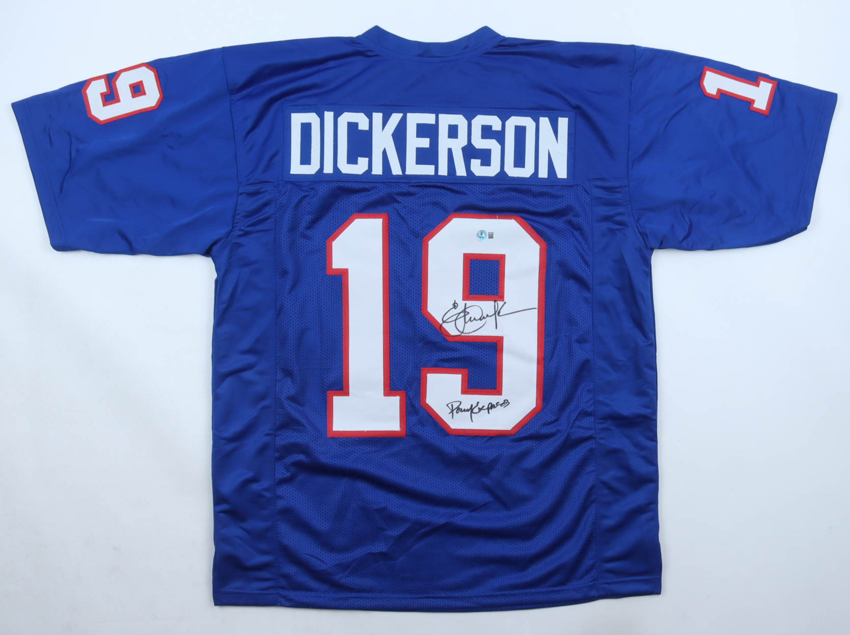 Custom jersey with everything sewn on. Hand-signed and inscribed by Eric Dickerson (SMU Mustangs, HOF).