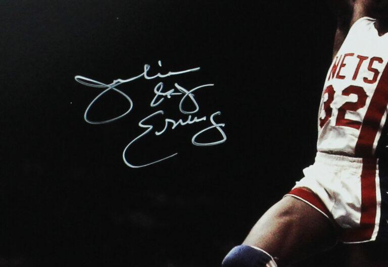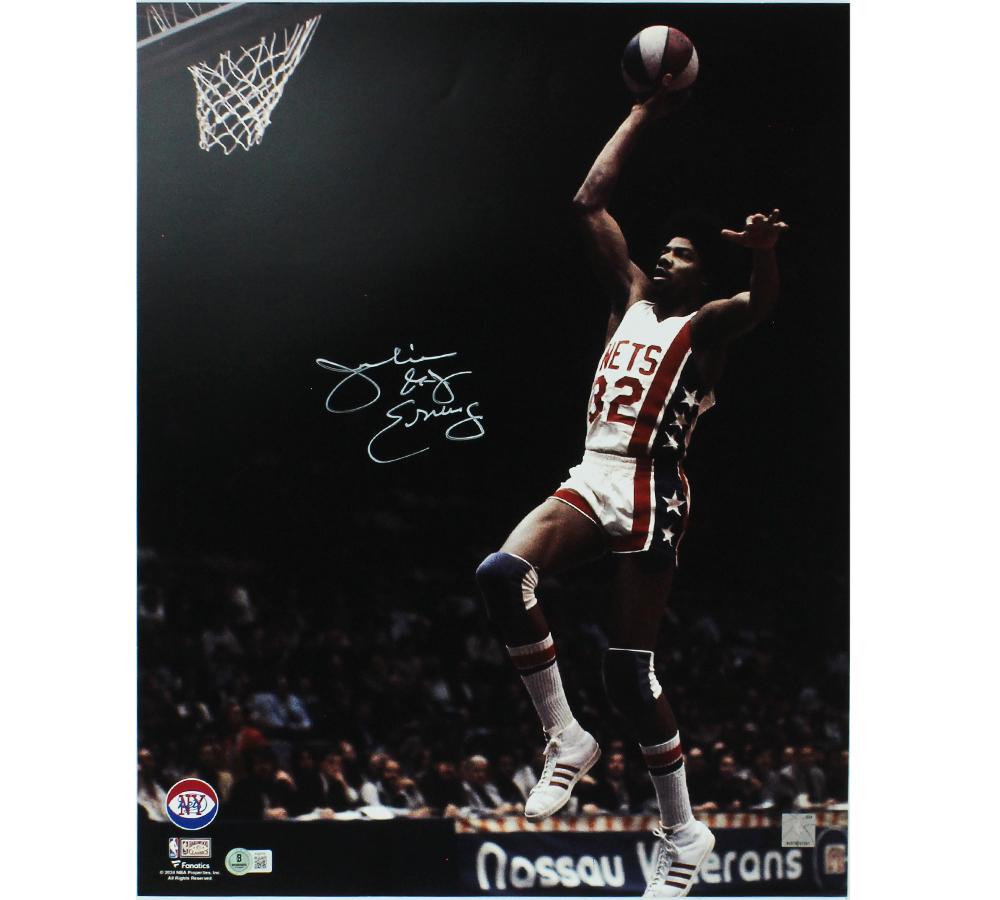 Photo measures 16” x 20” in size and has been hand-signed and inscribed by Julius Erving (Philadelphia 76ers, HOF). .