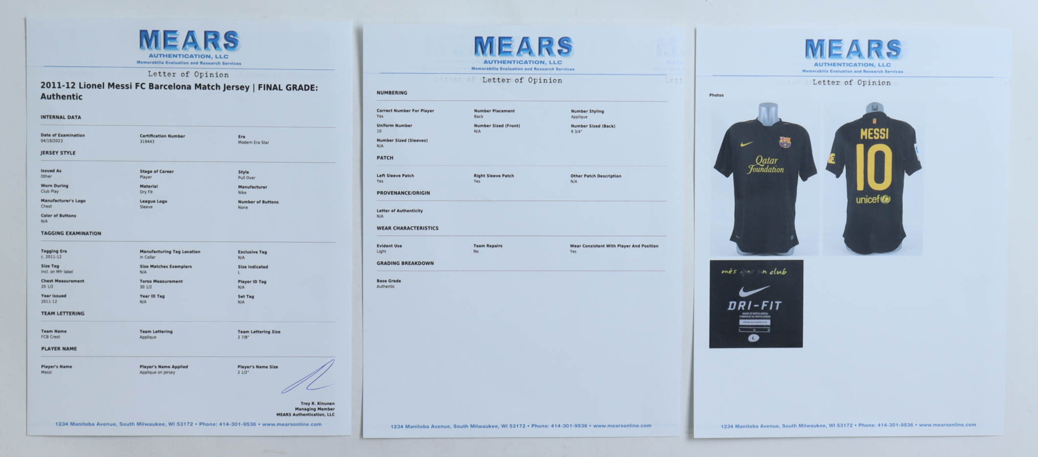 Match Issued Nike Dri-Fit jersey with everything pressed on, size L. The jersey was issued to Lionel Messi during the 2011-12 season. The jersey shows signs of light wear. Please note, the item is unsigned.