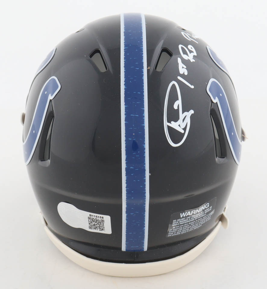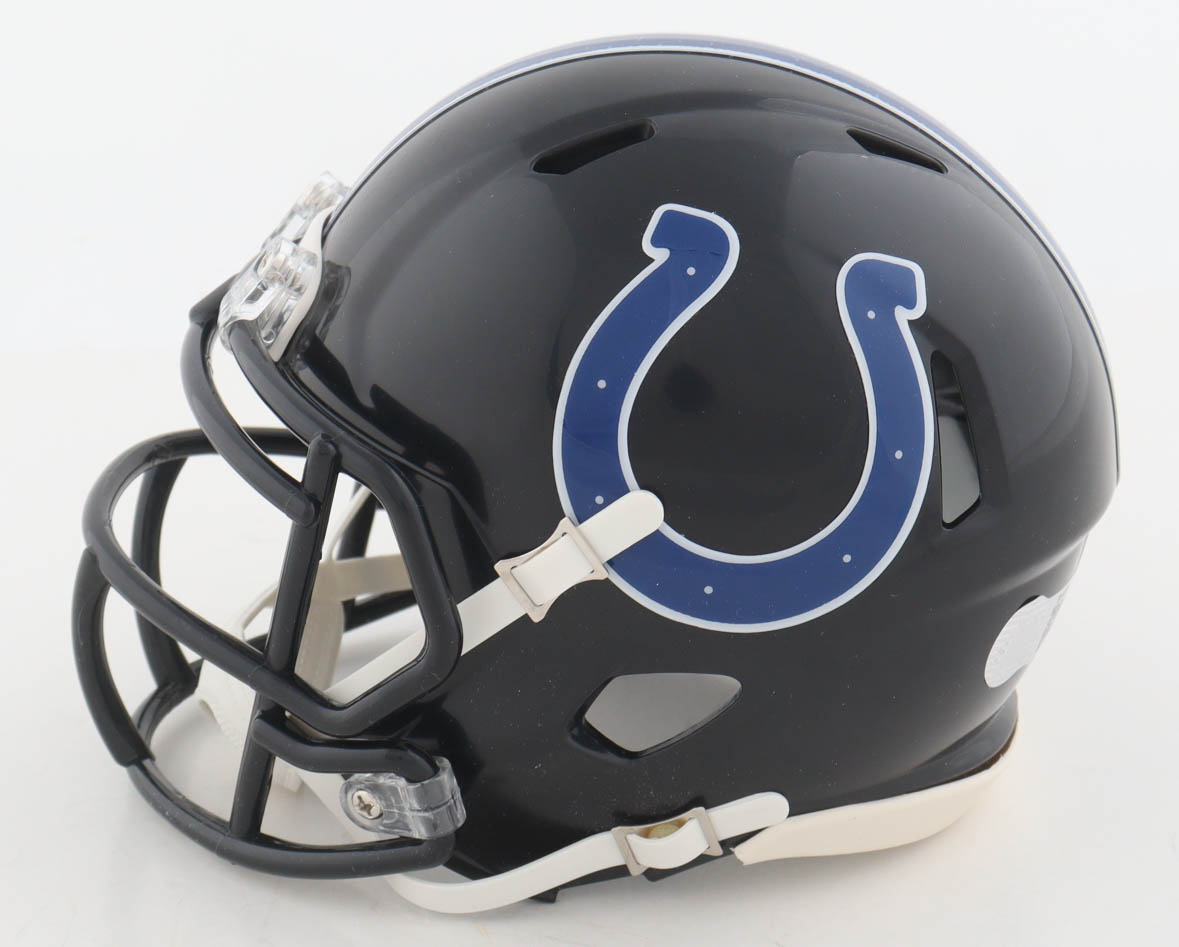 Riddell Indianapolis Colts 2023 Alternate Speed mini helmet. Hand-signed and inscribed by Andre Rison.
