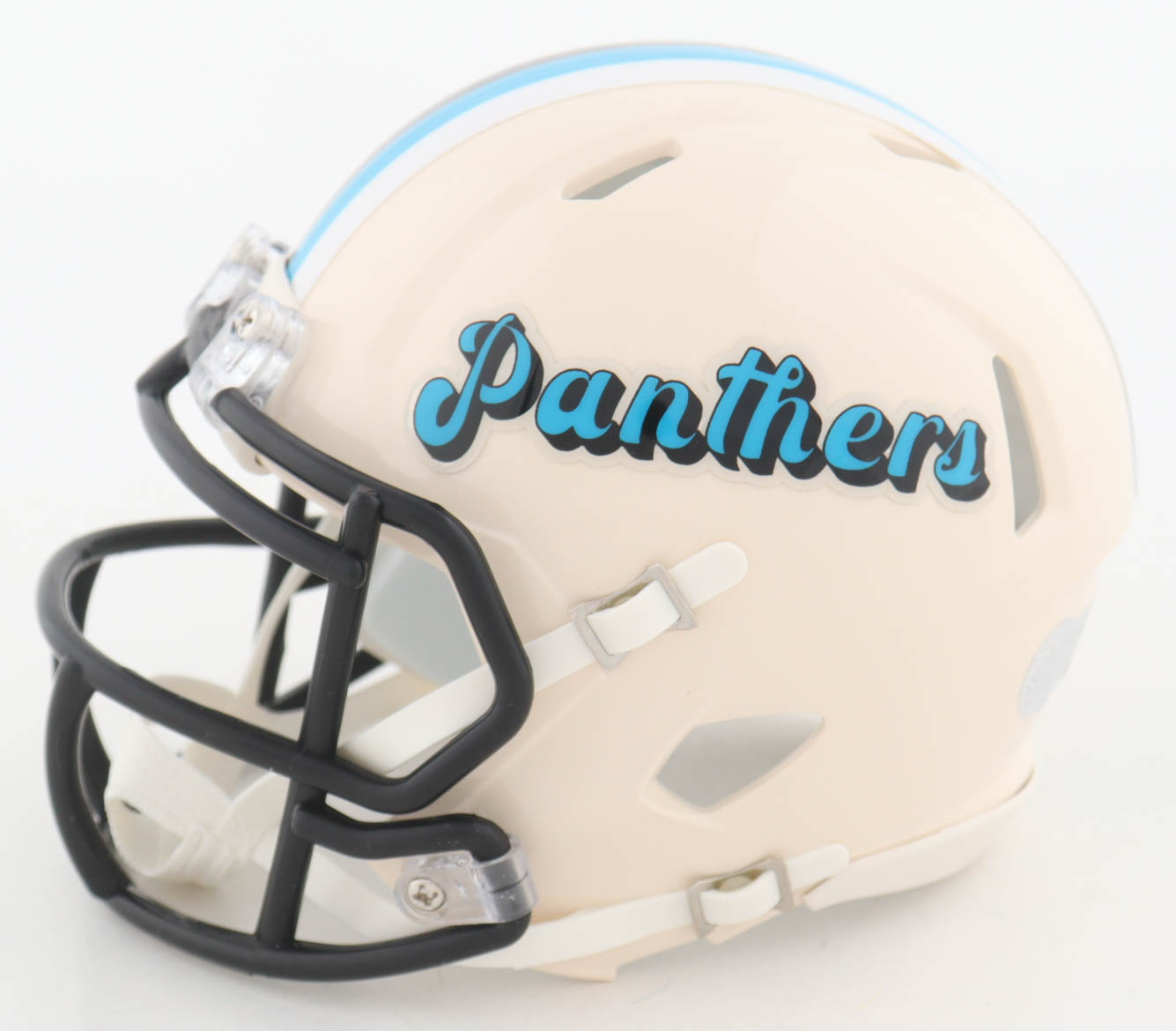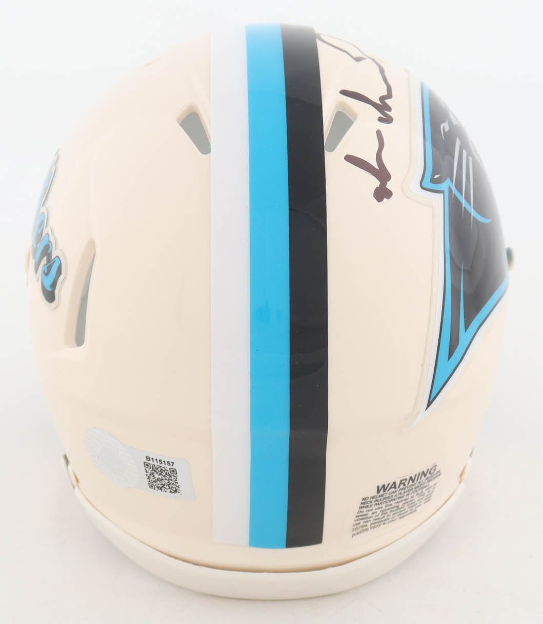 Riddell Carolina Panthers Retro Alternate Speed mini helmet has been hand-signed by Muhsin Muhammad.