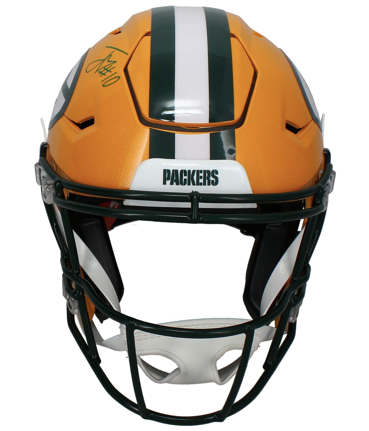 Riddell Green Bay Packers full-size authentic on-field speedflex helmet has been hand-signed by Jordan Love.
