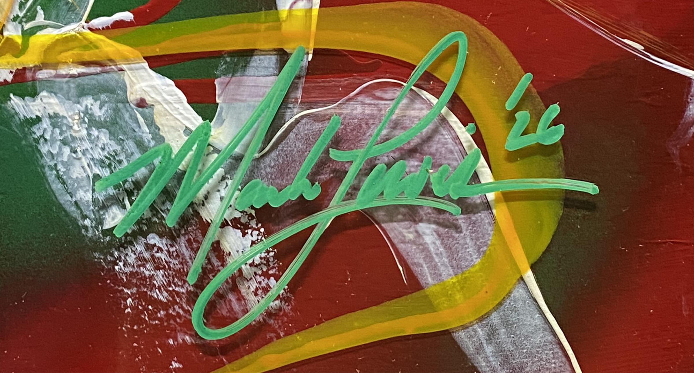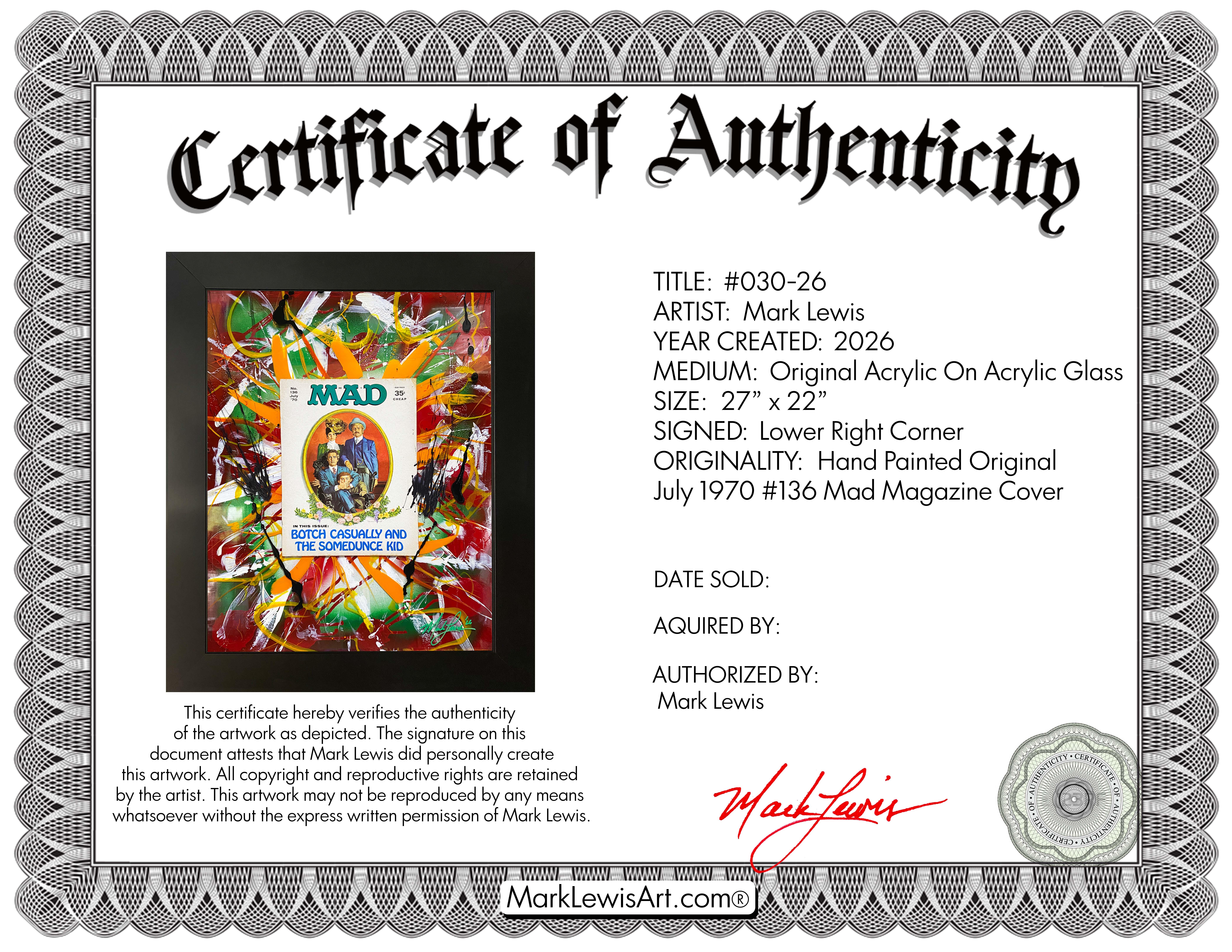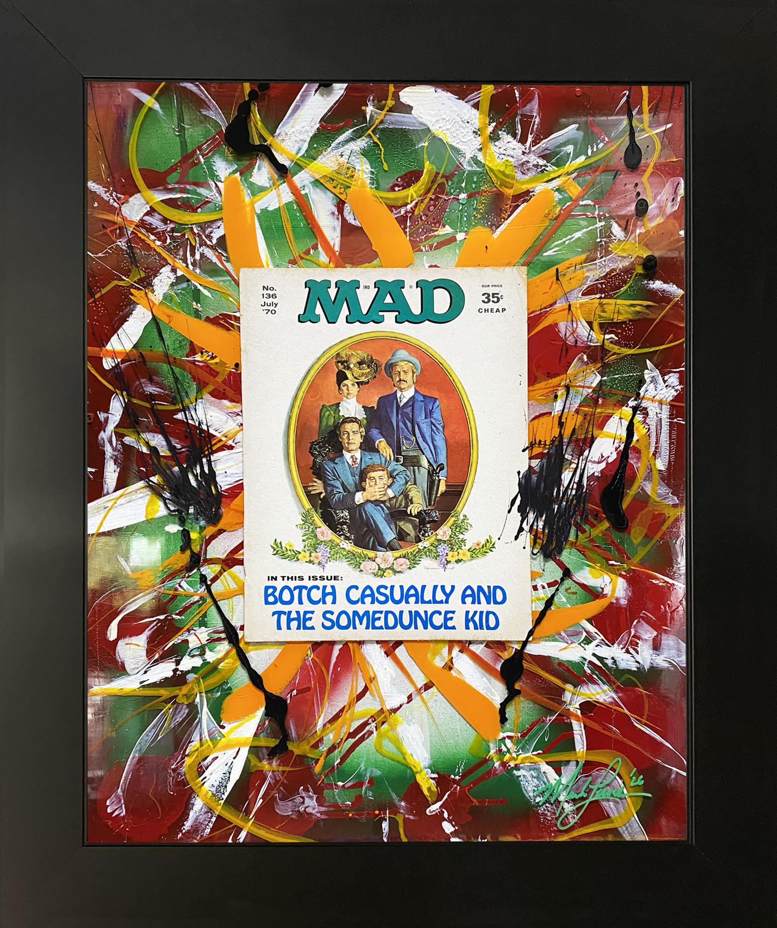 This vibrant composition features the original July 1970 cover of Mad Magazine No. 136, a classic parody of "Butch Cassidy and the Sundance Kid." Created by Mark Lewis great-grand-nephew of MLB legend Cy Young - this work seamlessly integrates American satire with modern abstract expressionism. The vintage cover is framed by an explosive burst of fiery oranges, deep reds, and forest greens, punctuated by sharp black splatters and white highlights. Painted directly onto premium acrylic glass, the piece achieves a luminous 3D depth where the energetic paint strokes appear to float over the archival magazine center. This work offers a rare opportunity to own a piece that bridges pop-culture history with a storied American lineage.
