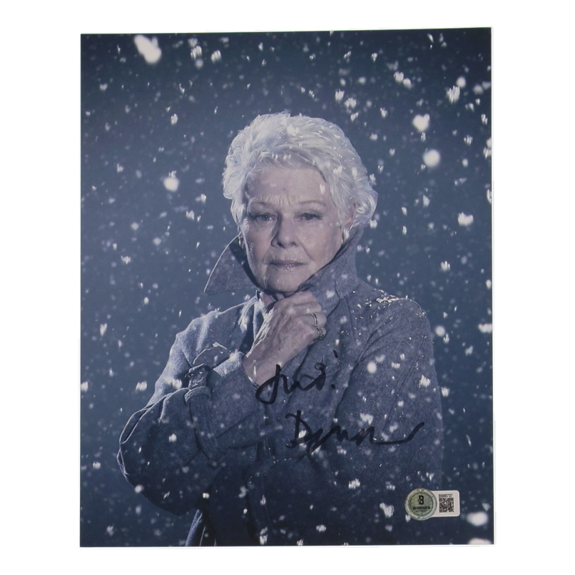 Photo measures approximately 8" x 10" in size. Hand-signed by Judi Dench. Please note, the top-right corner is creased.