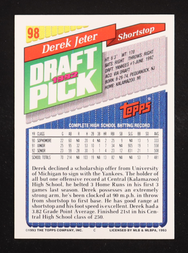 Derek Jeter 1993 Topps #98 RC