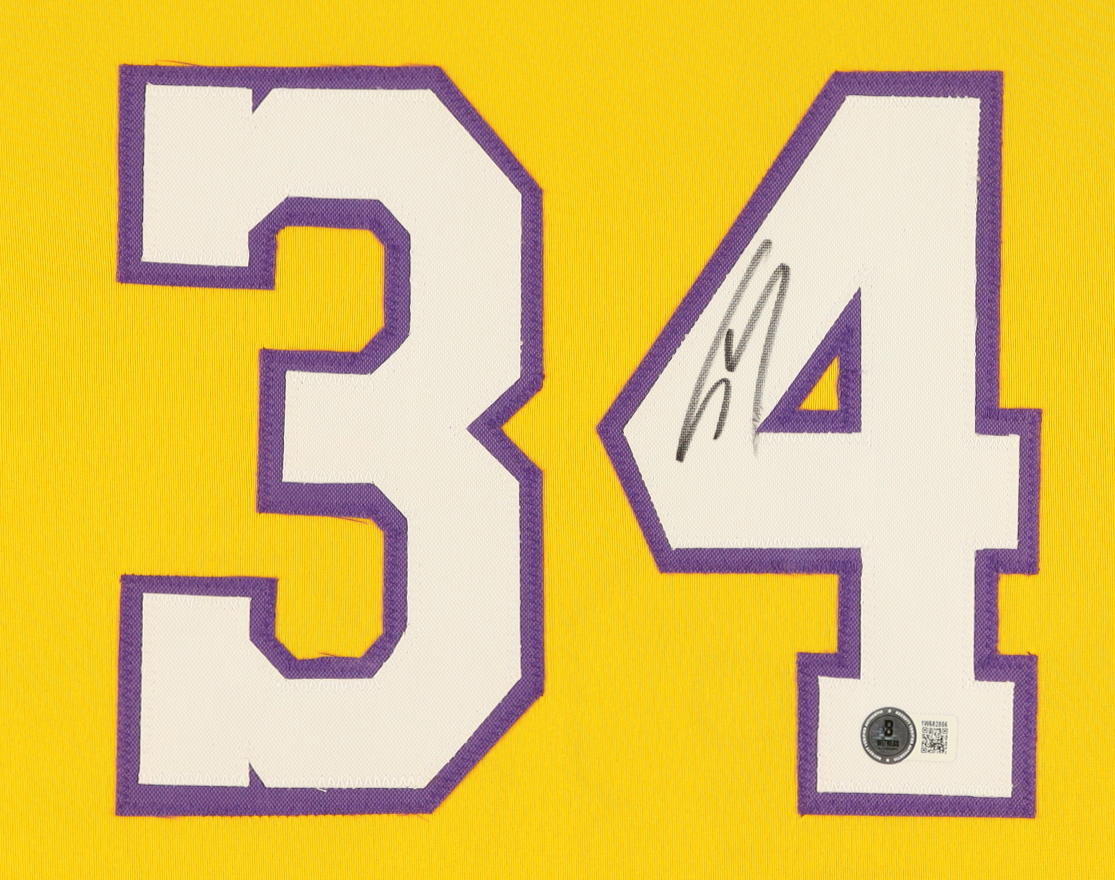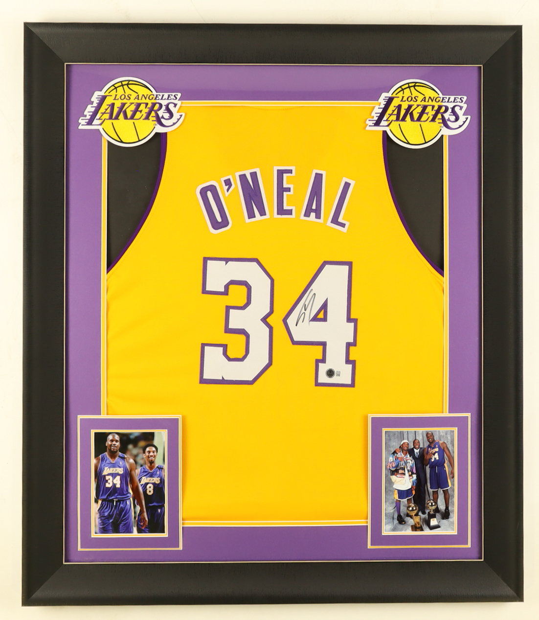 Custom framed display measures approximately 32" x 37" in size and features a jersey that has been hand-signed by Shaquille O'Neal (HOF).