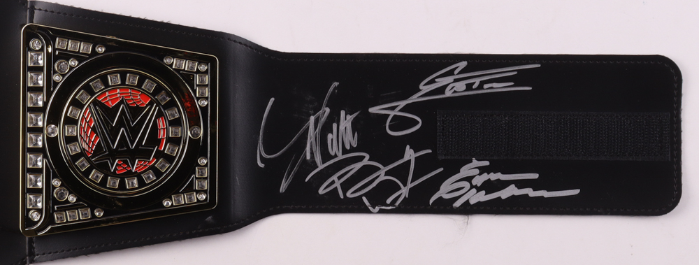 WWE plastic toy replica championship belt. Measures approximately 39" in length. Hand-signed and inscribed by Ricky Steamboat (HOF), Brutus Beefcake (HOF), KoKo B. Ware (HOF), Greg The Hammer Valentine, Barry Windham, The Godfather Papa Shango, Hacksaw Jim Duggan and Earl Hebner. See photos for more details on condition of item.
