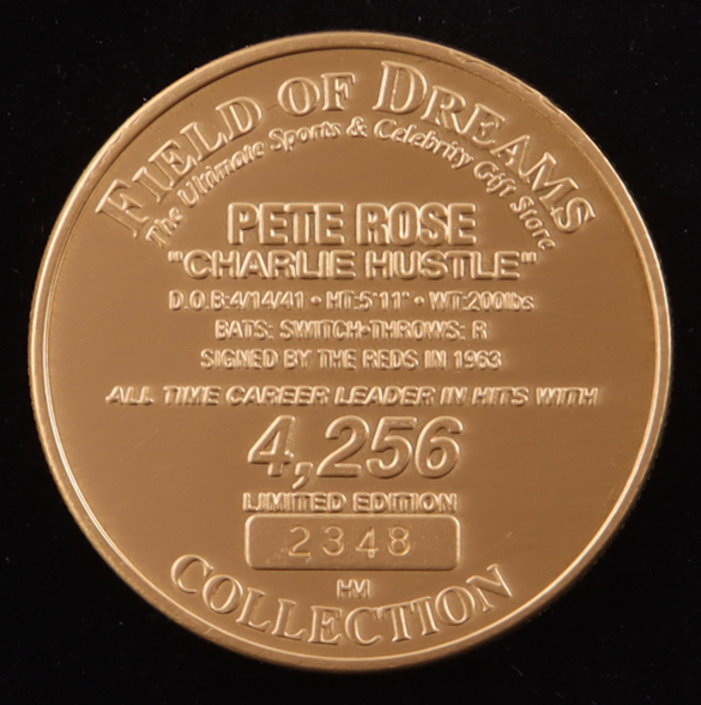 The Field of Dreams Collection Pete Rose Highland Mint bronze coin. The coin is limited edition, numbered #2,348 / 4,192.