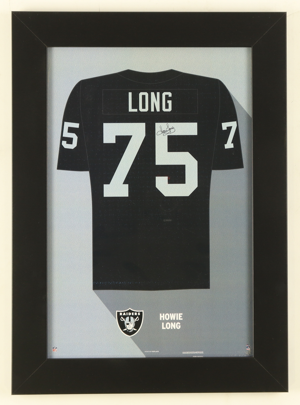 Custom frame measures 14" x 20" in size and features a photo of the jersey of Howie Long (Los Angeles Raiders). Please note, the signature on the photo is a facsimile.