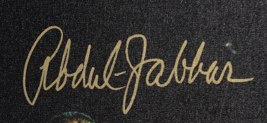 Custom frame measures approximately 27.5" x 39.5" in size. Features a canvas photo that has been hand-signed by Magic Johnson and Kareem Abdul-Jabbar (Los Angeles Lakers, HOF). Please note, there is scuffing throughout the frame.