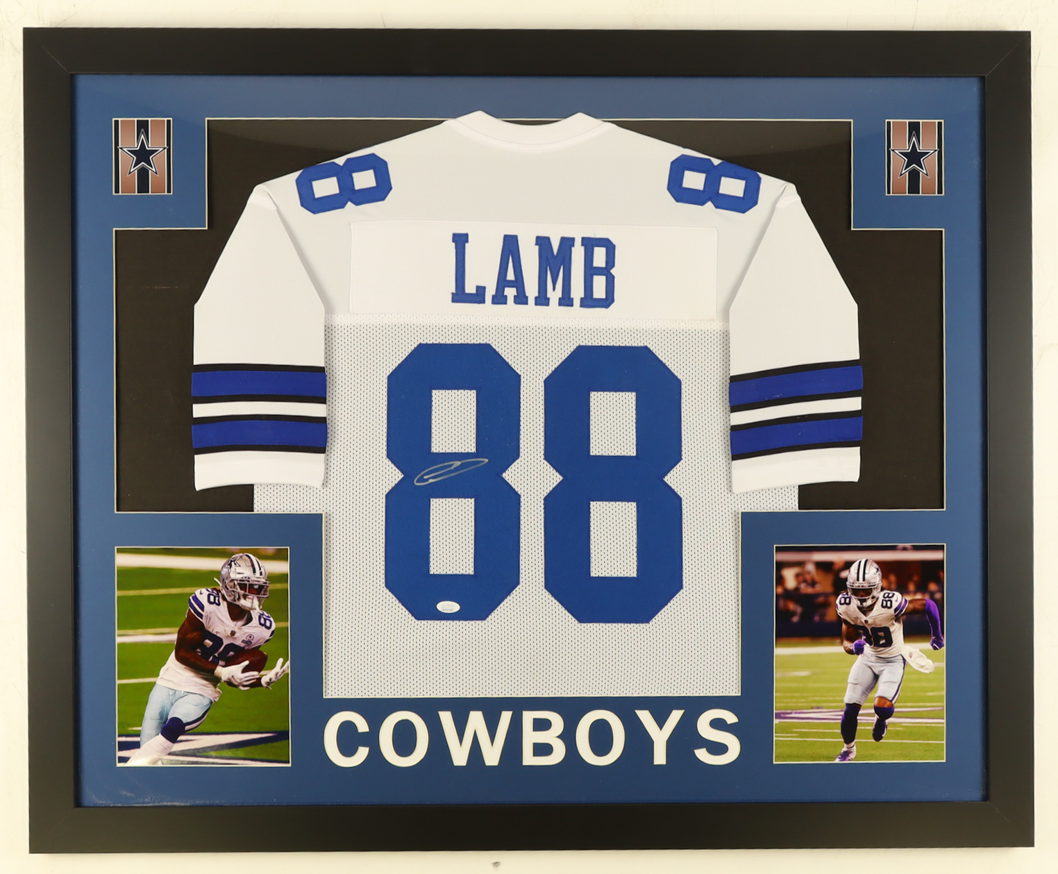 Custom frame measures approximately 35" x 43" in size and features a jersey that has been hand-signed by Ceedee Lamb.