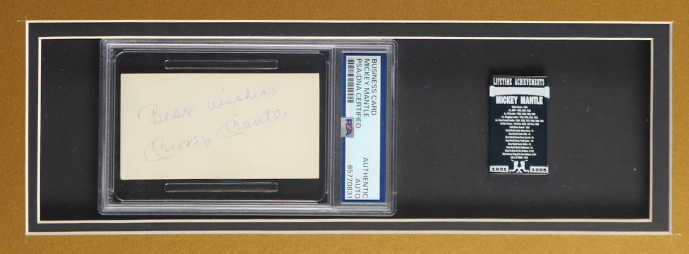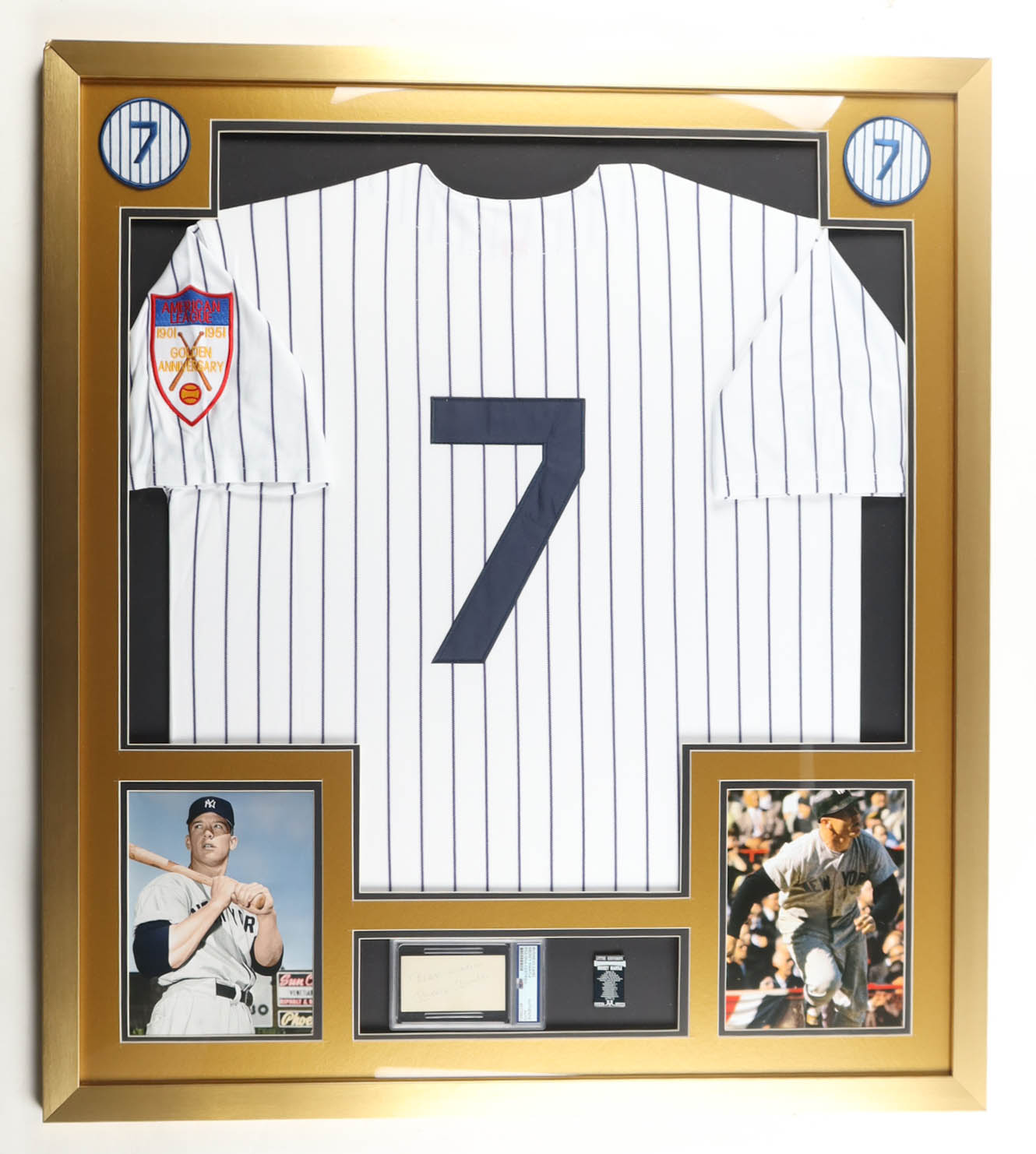 Custom frame measures approximately 32" x 36" in size and features a cut that is encapsulated and has been hand-signed and inscribed by Mickey Mantle (D. 1995, New York Yankees, HOF). The display also includes an unsigned 1951 Rookie Jersey, a Vintage Lifetime Achievements Pin, (2) Photos, and (2) #7 Jersey Retirement Patches.