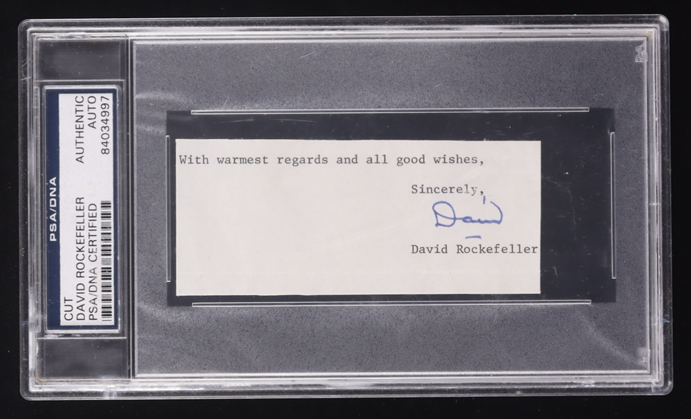 Cut measures approximately 2" x 4" in size. Hand-signed by David Rockefeller (D. 2017). Please note the signature is only of the first name.