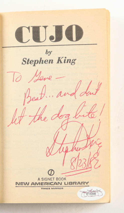 Stephen King Signed "Cujo" Paperback Book Inscribed "Best... And Don't Let The Dog Bite!" & "8/23/82" (JSA)