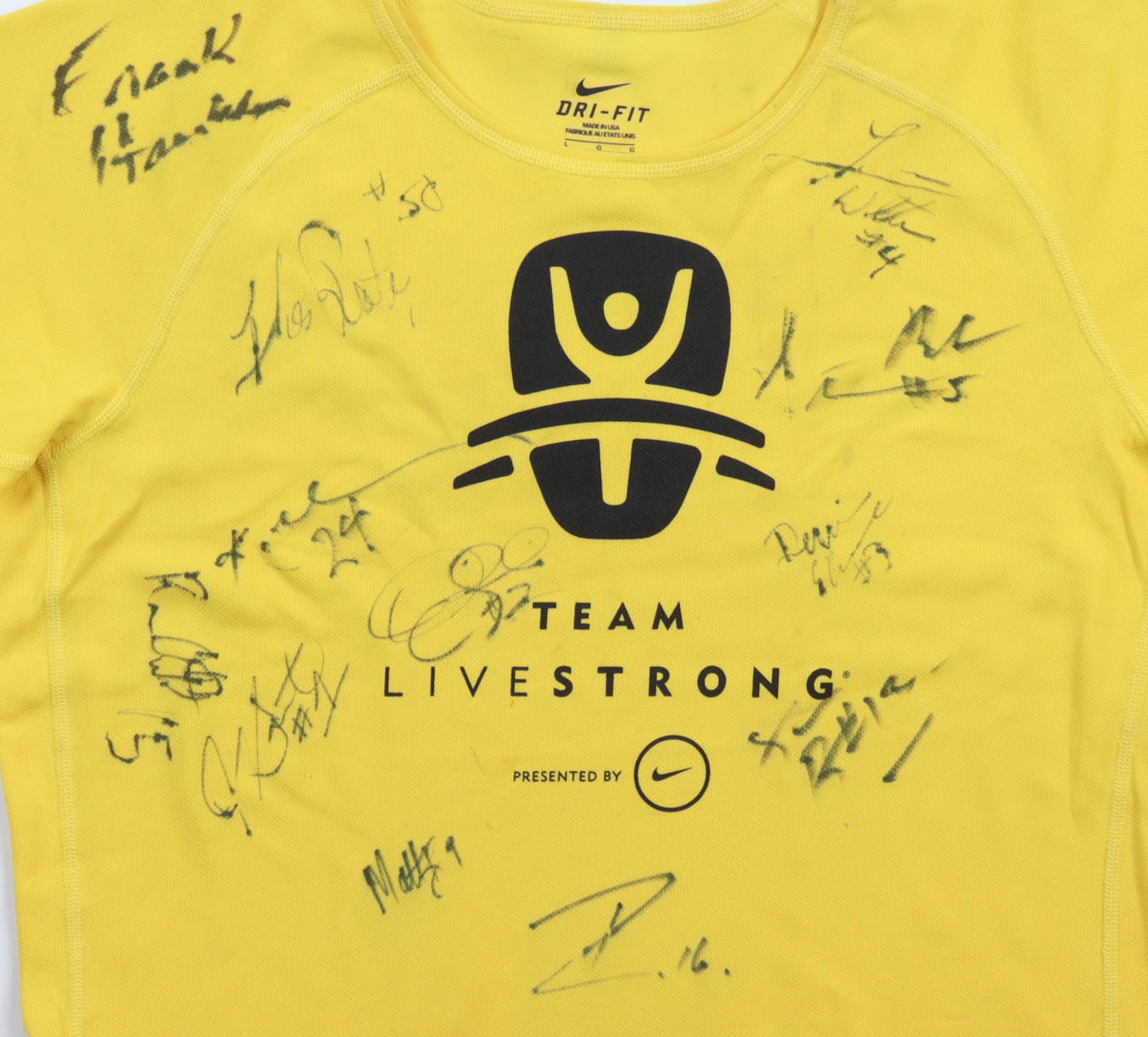 2010-2011 Los Angeles Lakers Team-Signed "Team Livestrong" T-Shirt by (12) with Kobe Bryant, Pau Gasol, Ron Artest, Derek Fisher (Beckett & PSA)