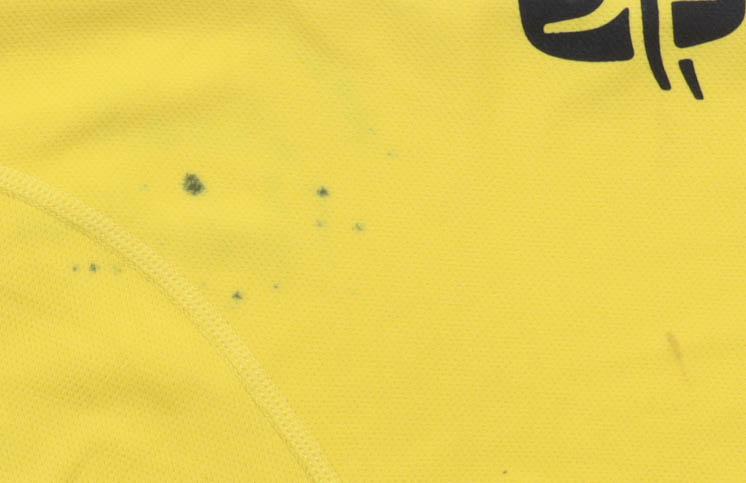 Please note, there is staining through out the t-shirt and ink has bled through the right shoulder. See photos regarding the condition of the item