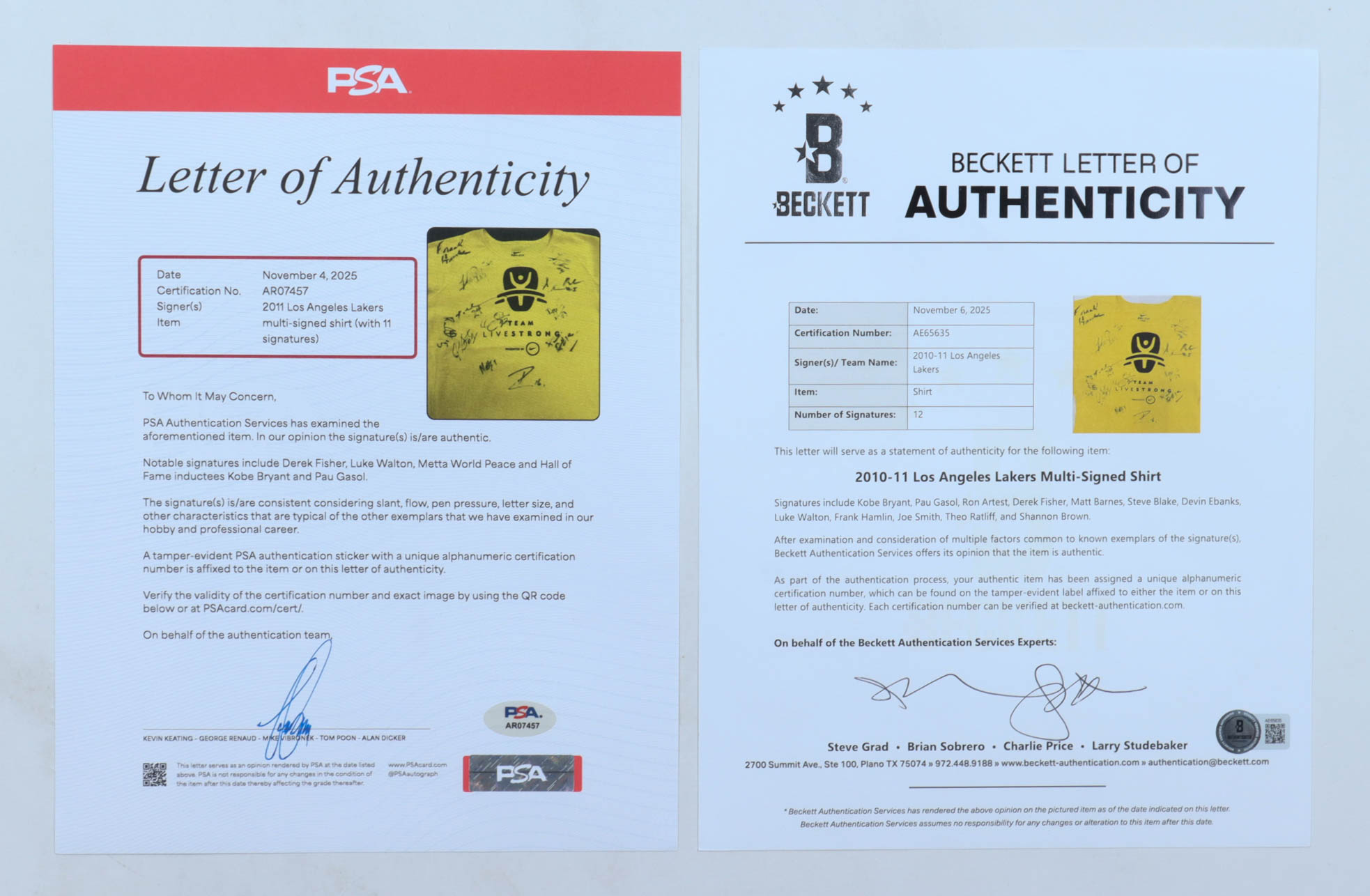Nike authentic T-shirt with everything pressed on, size L. Hand-signed by (12) with Kobe Bryant (D.2020, HOF), Pau Gasol (HOF), Ron Artest, Derek Fisher, Matt Barnes, Steve Blake, Devin Ebanks, Luke Walton, Frank Hamlin, Joe Smith, Theo Ratliff, and Shannon Brown.
