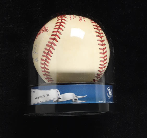 Rawlings Official 1988 World Series Baseball. Hand-signed and inscribed by Kirk Gibson (Los Angeles Dodgers). Please note, the baseball is naturally toned.