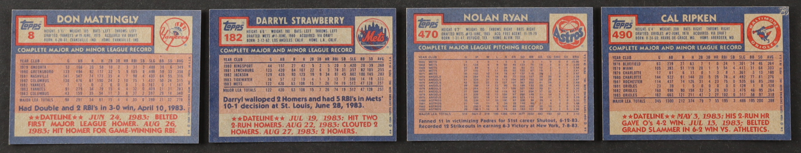 1984 Topps Baseball Complete Set of (792) Cards with Don Mattingly #8 RC, Cal Ripken #490, Darryl Strawberry #182 RC, Nolan Ryan #470