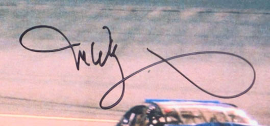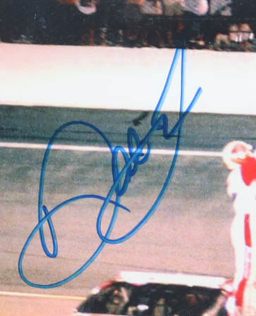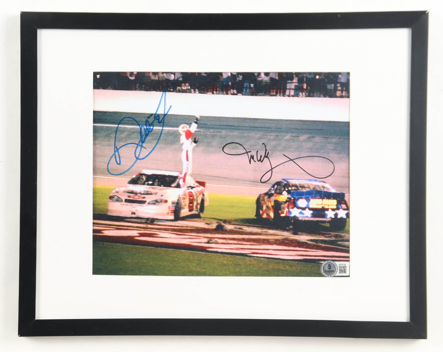 Custom frame measures approximately 12" x 15" in size and features a photo that has been hand-signed by Dale Earnhardt Jr. (HOF) and Michael Waltrip. Please note, there is scuffing throughout the frame.