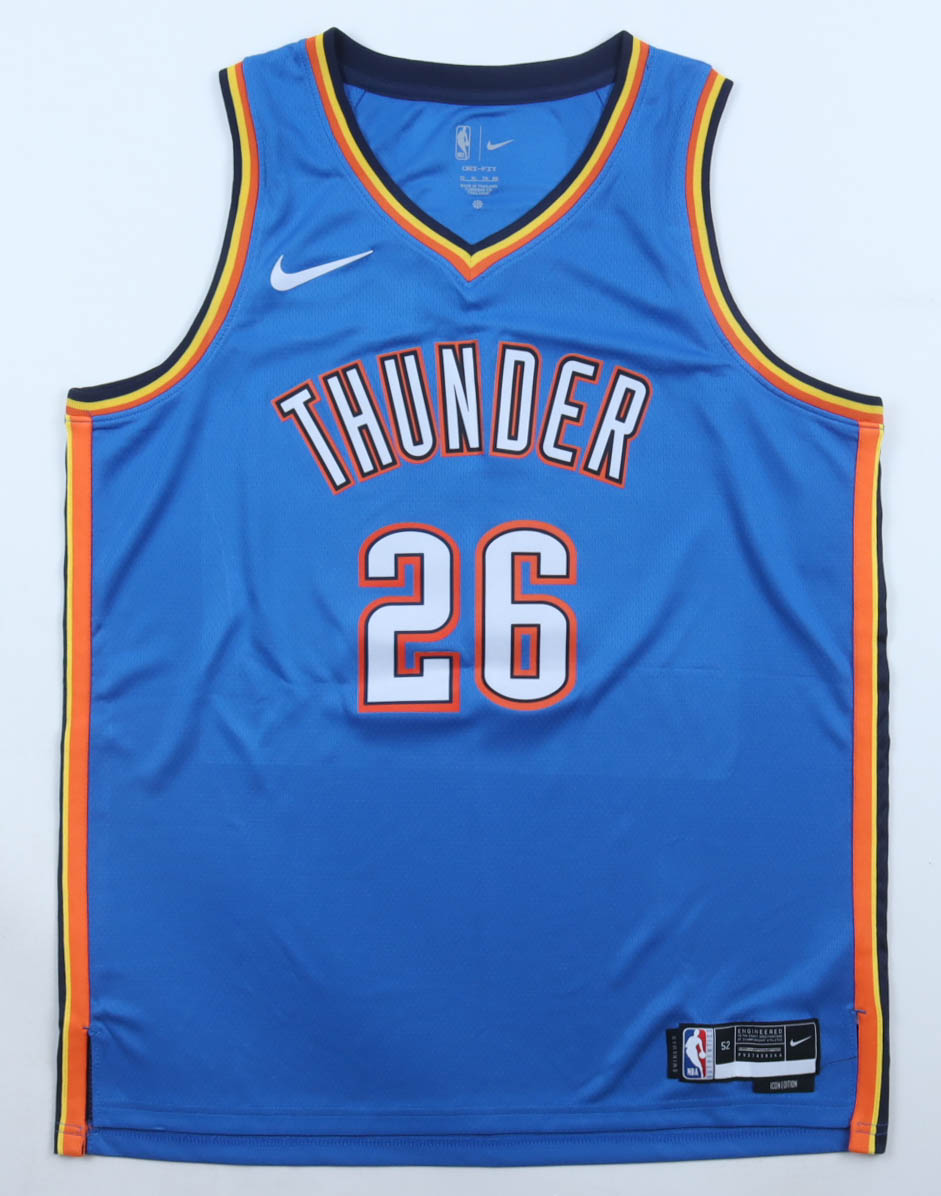 Nike jersey with everything pressed on, size 52. Hand-signed by Shai Gilgeous-Alexander, Thomas Sorber, Ajay Mitchell, Isaiah Hartenstein, Branden Carlson & 2 others (Oklahoma City Thunder). Please note, some signatures have bled.