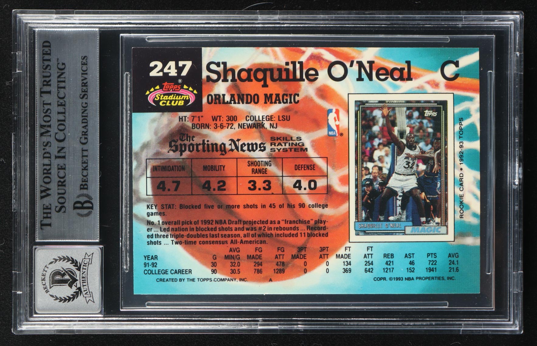 Shaquille O'Neal Signed 1992-93 Stadium Club #247 RC (BGS)