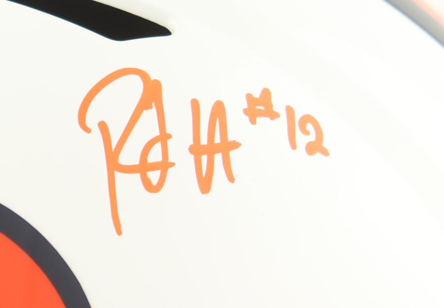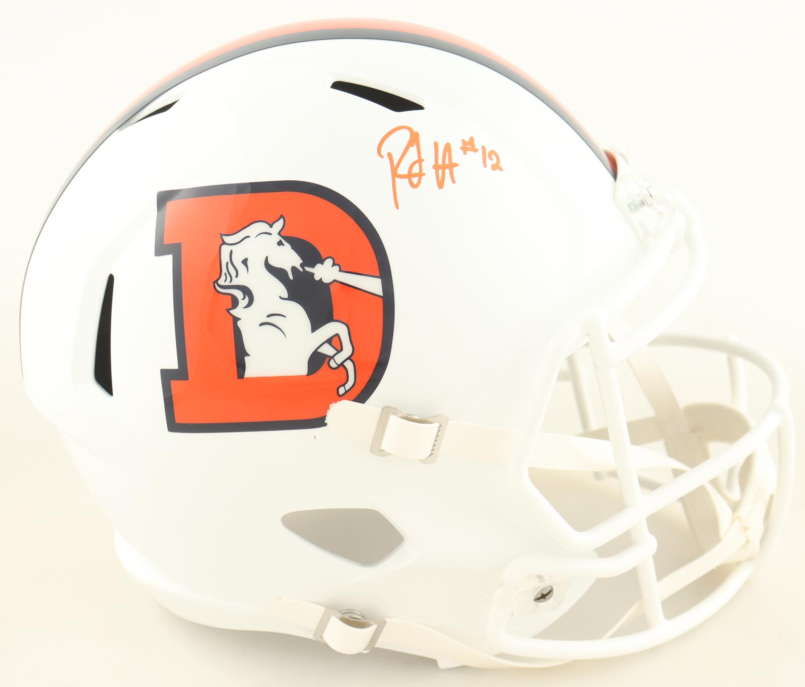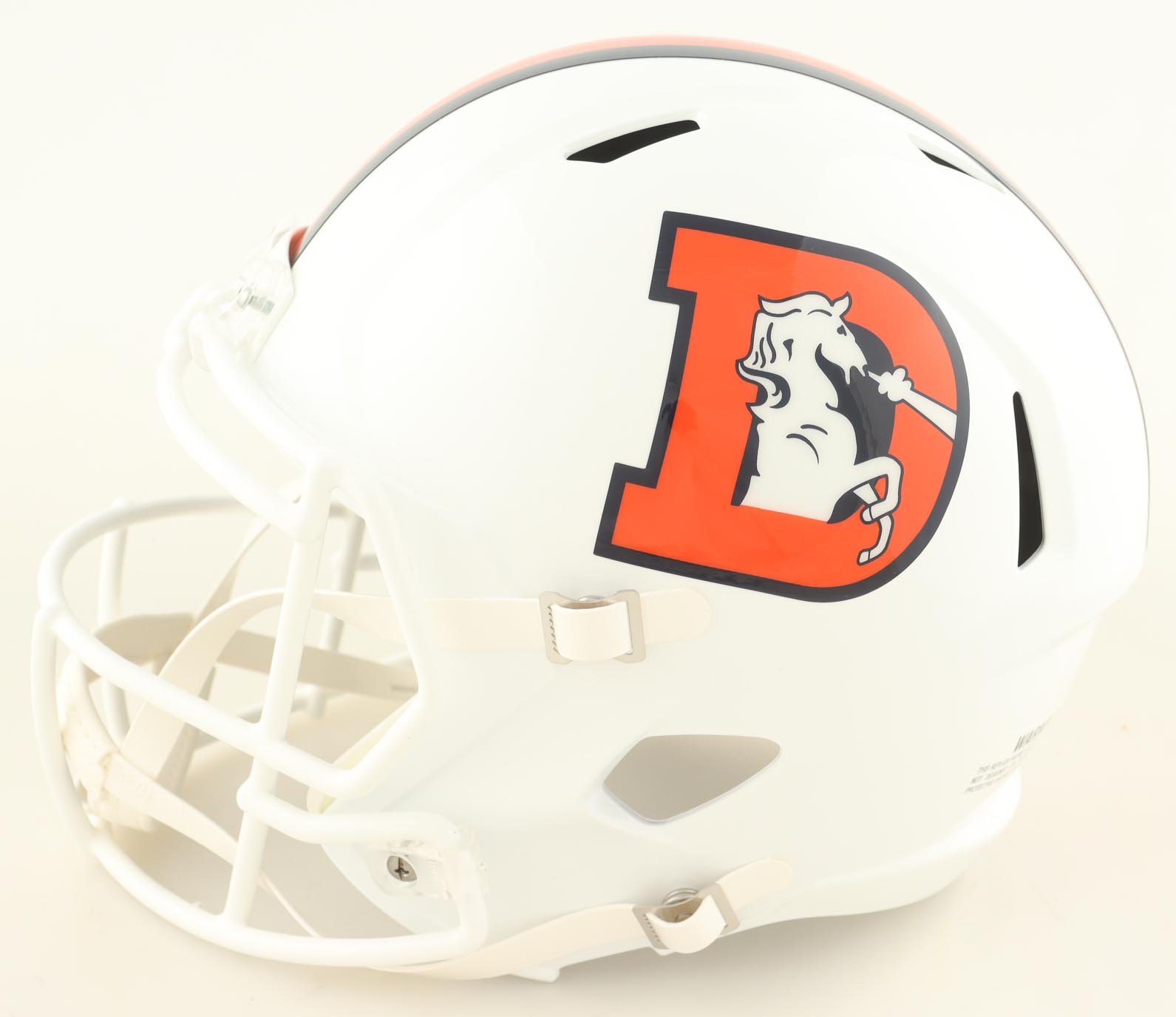 Riddell Denver Broncos full-size Throwback Alternate replica speed helmet has been hand-signed by RJ Harvey.