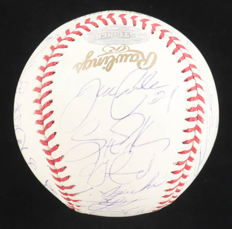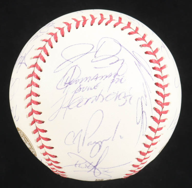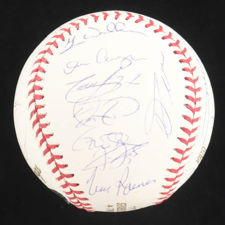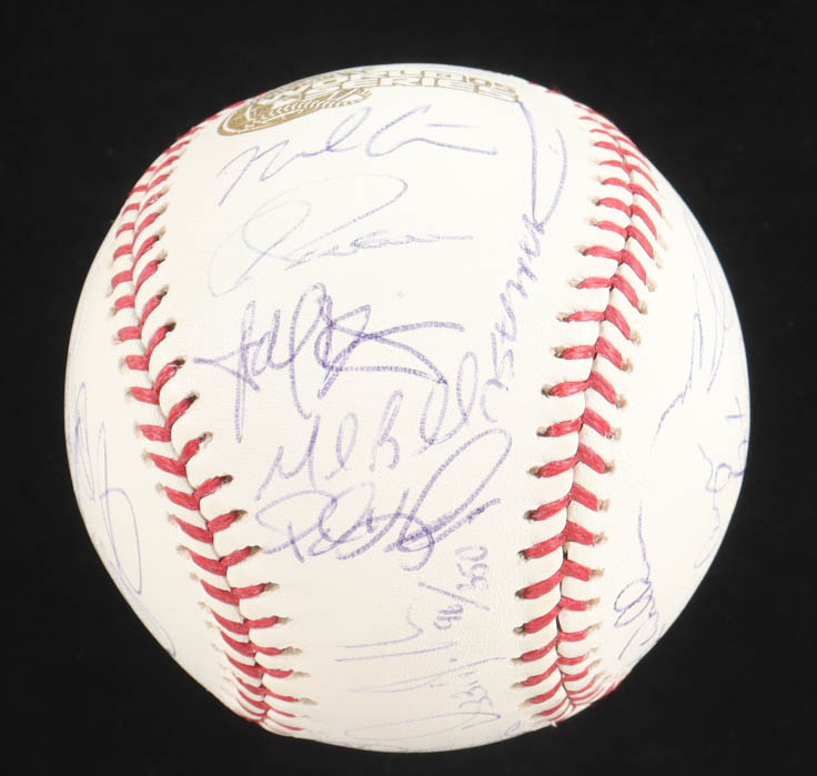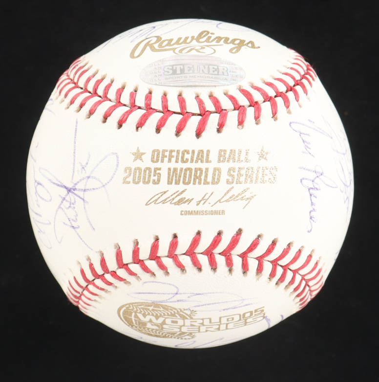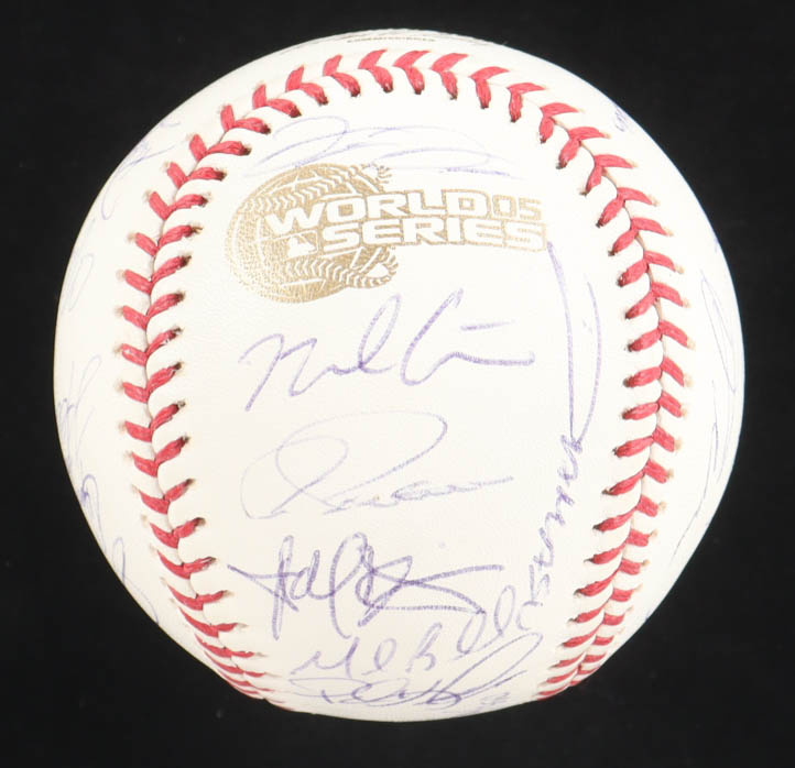 2005 World Series Logo Baseball. Hand-signed by (28) with Ozzie Guillen, Harold Baines, Frank Thomas, Tim Raines, Scott Podsednik, Aaron Rowand, Greg Walker, Jon Garland, A.J. Pierzynski, Pablo Ozuna, Geoff Blum, Joe Crede, Tadahito Iguchi, Paul Konerko, Juan Uribe, Jermaine Dye, Don Cooper, Timo Perez, Luiss Vizcaino, Cliff Politte, Dmaso Marte, Bobby Jenks, Orlando Hernandez, Dustin Hermanson, Freddy Garcia, Neal Cotts, Jose Contreras and Mark Buehrle. Limited edition #96/350.
