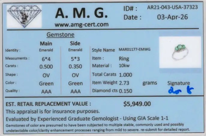 1 CTW Natural Diamonds & Emeralds 10K WG Designer Ring | Estimated Retail Value: $5,949 (AMG)