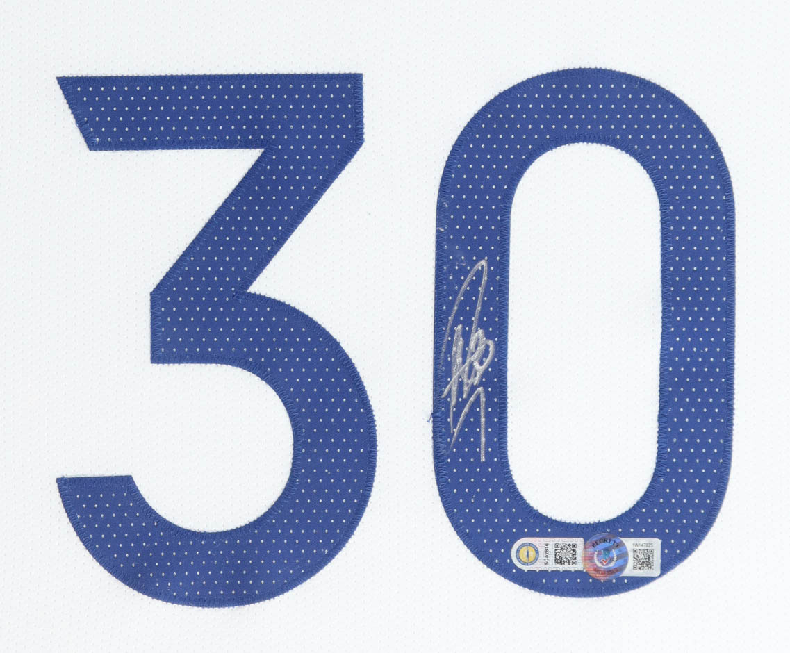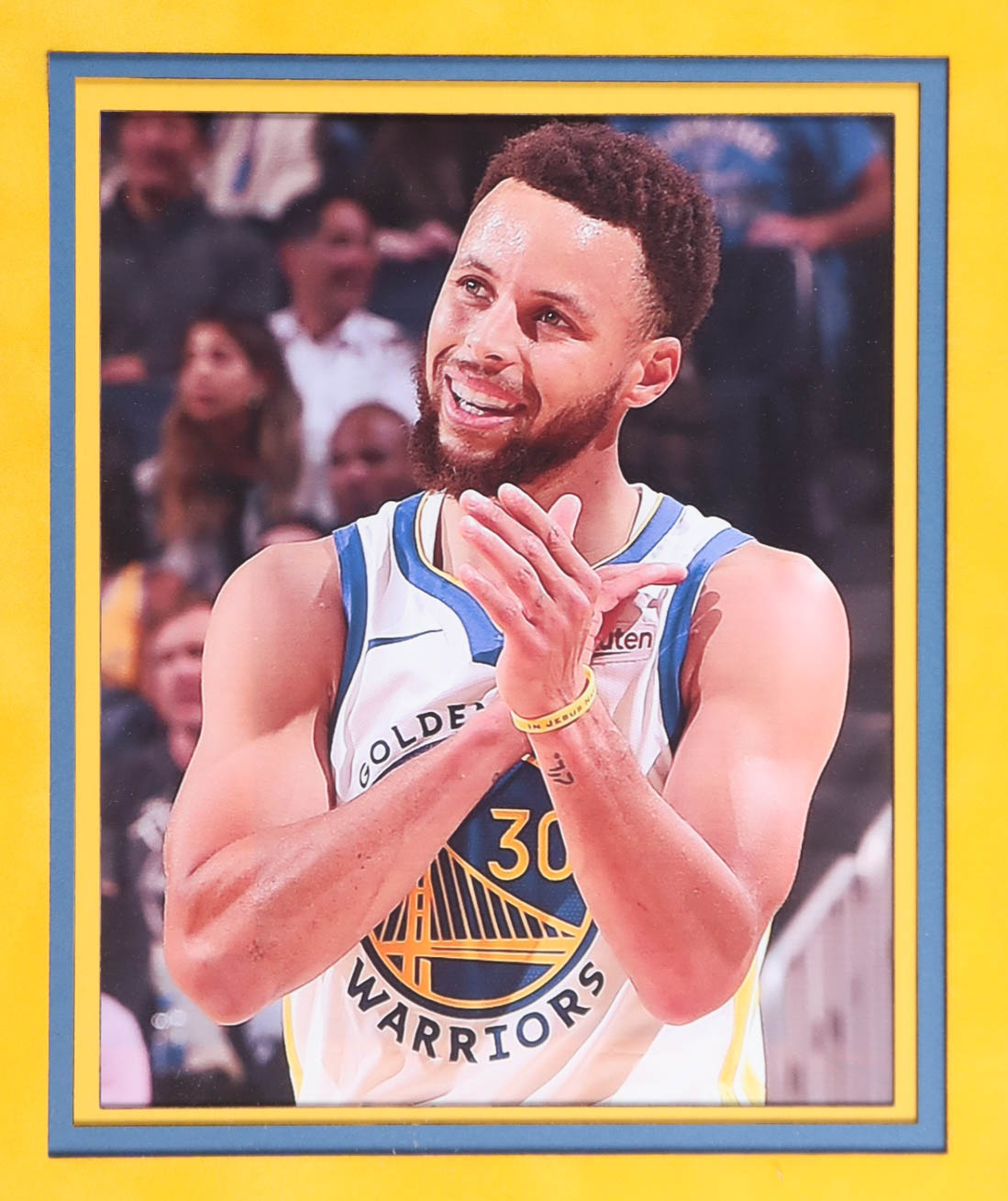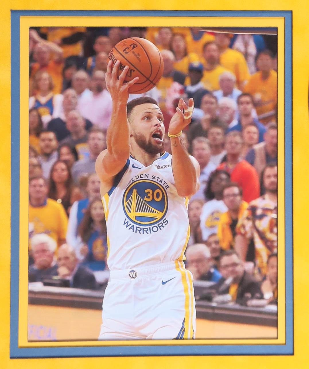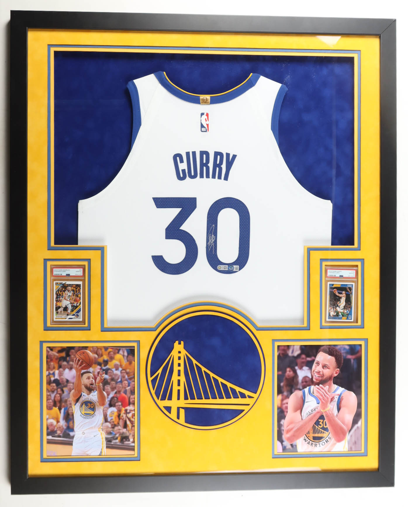 Custom frame measures 32" x 43" in size and features a jersey that has been hand-signed by Stephen Curry. Display also includes (2) 8" x 10" photos, jumbo Warriors Logo and (2) (PSA) graded sports cards. Please see photos for more details regarding the condition of the item. Description of the (2) cards is listed below.