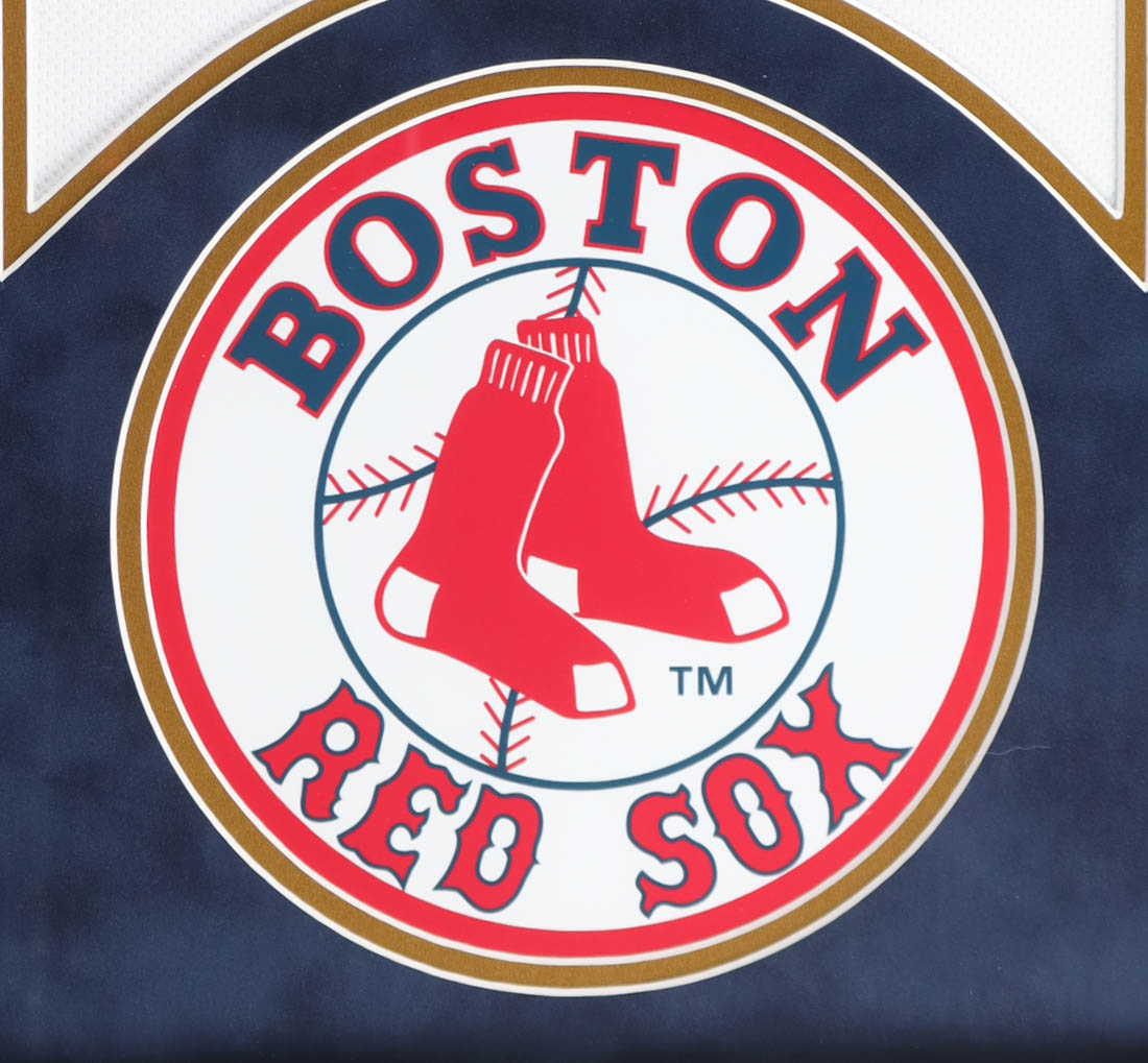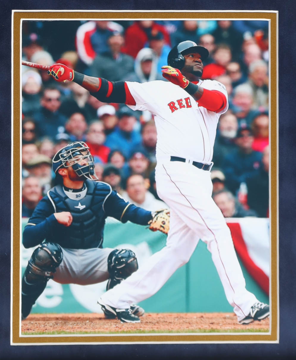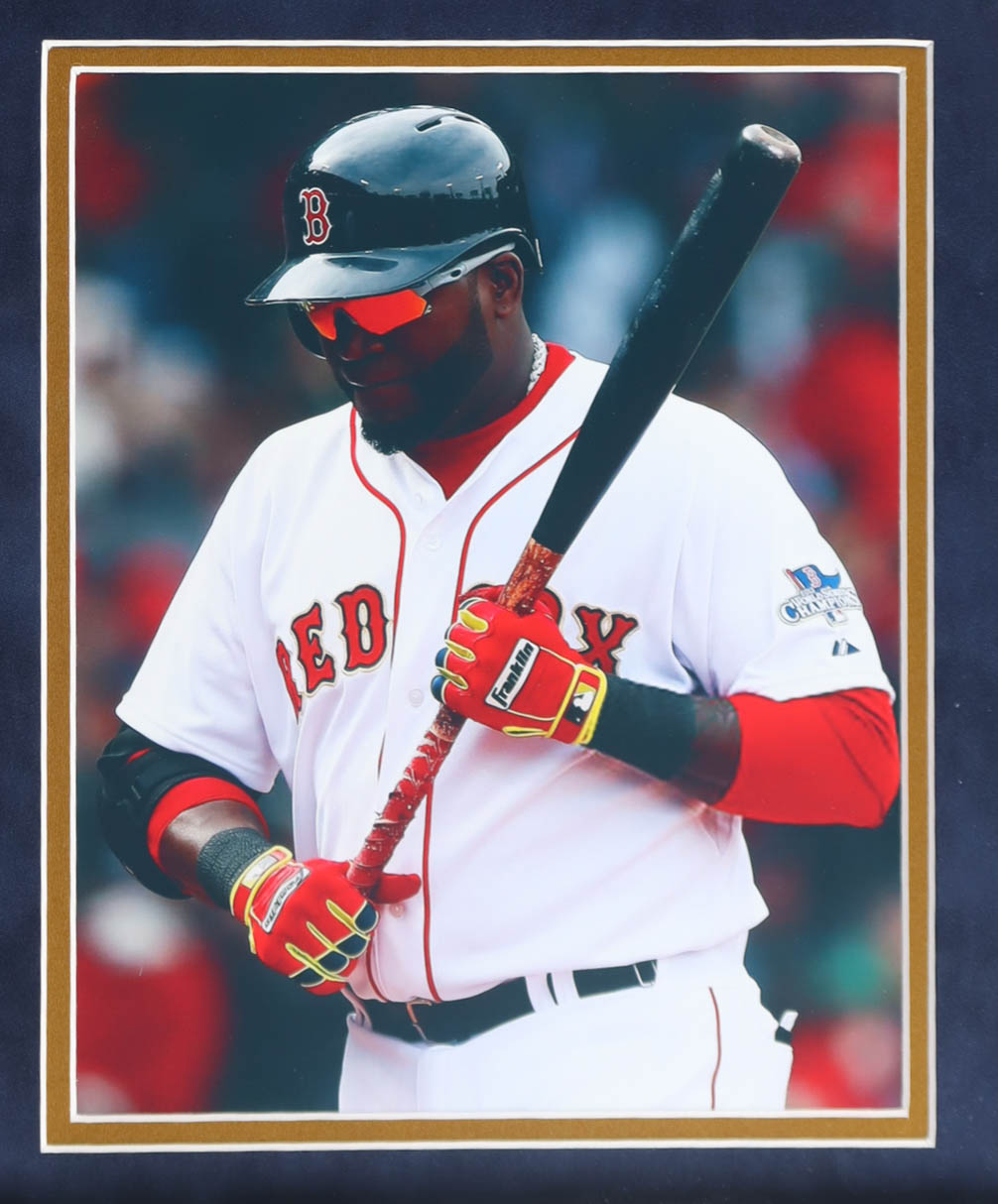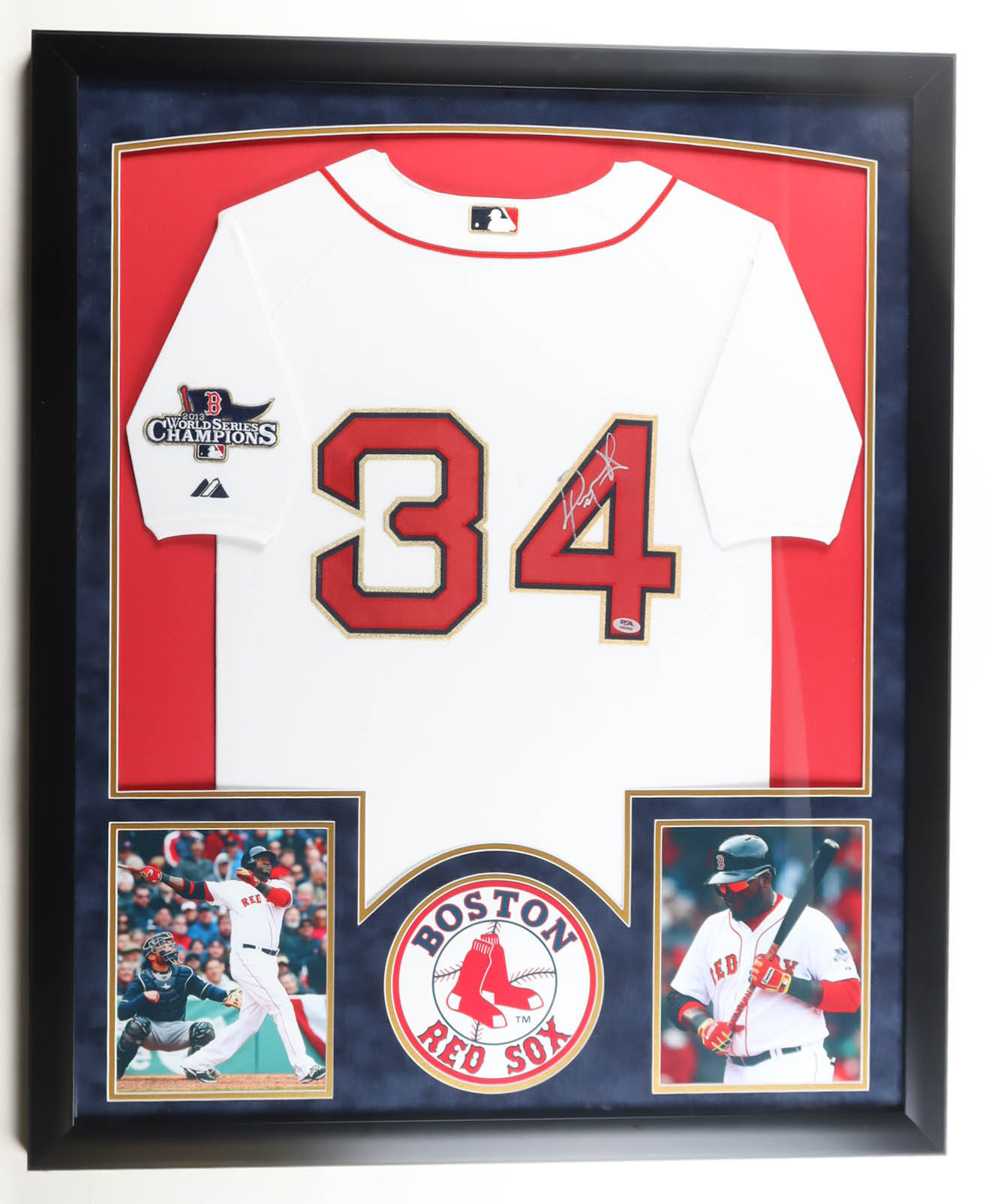 Custom frame measures approximately 32" x 40" in size. Boston Red Sox jersey is hand-signed by David Ortiz (HOF). Display also includes a team logo patch and (2) unsigned photographs.