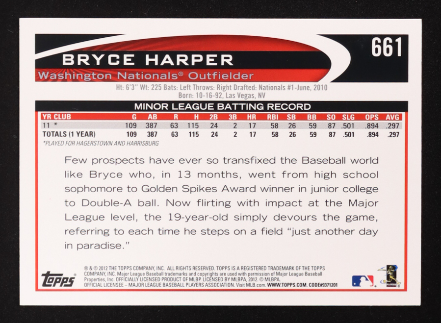 Bryce Harper 2012 Topps #661D Yelling/Factory set RC