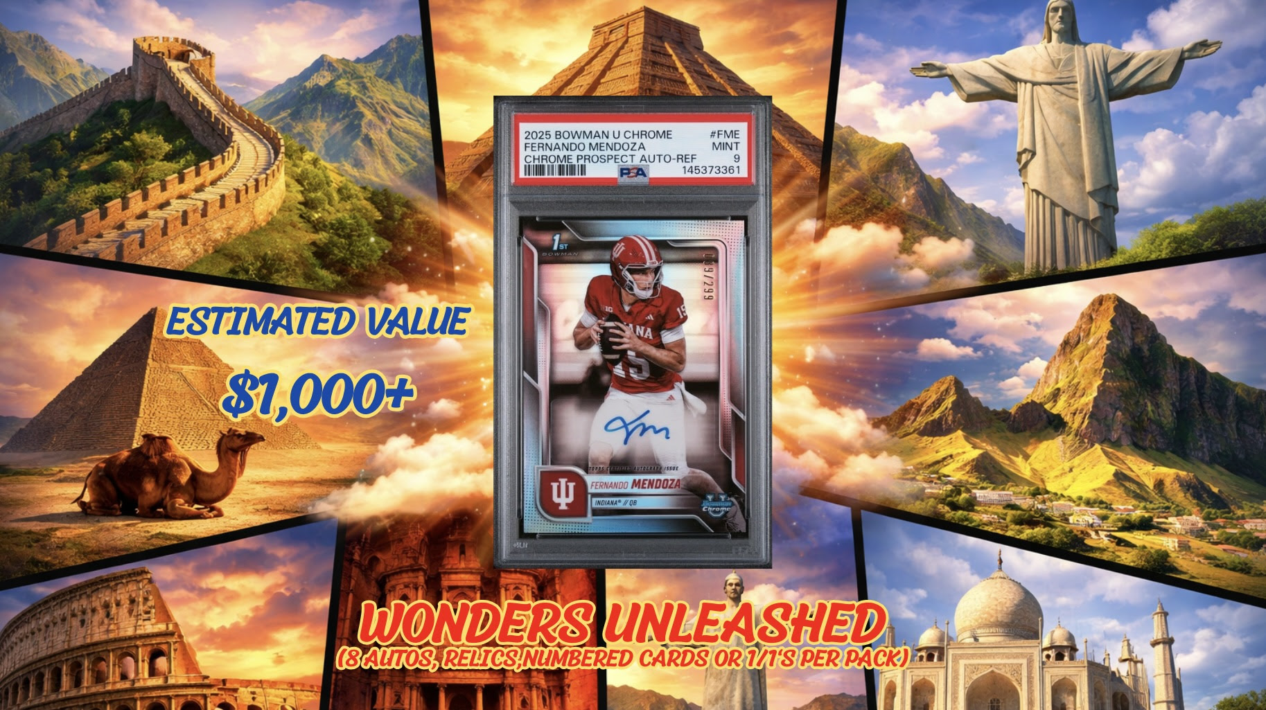$3K+ Tom Brady rookie auto, $1.2K Caitlin Clark PSA auto, $1K+ Fernando Mendoza PSA rookie auto. (8 autos, relics, numbered cards, or 1/1s per pack)