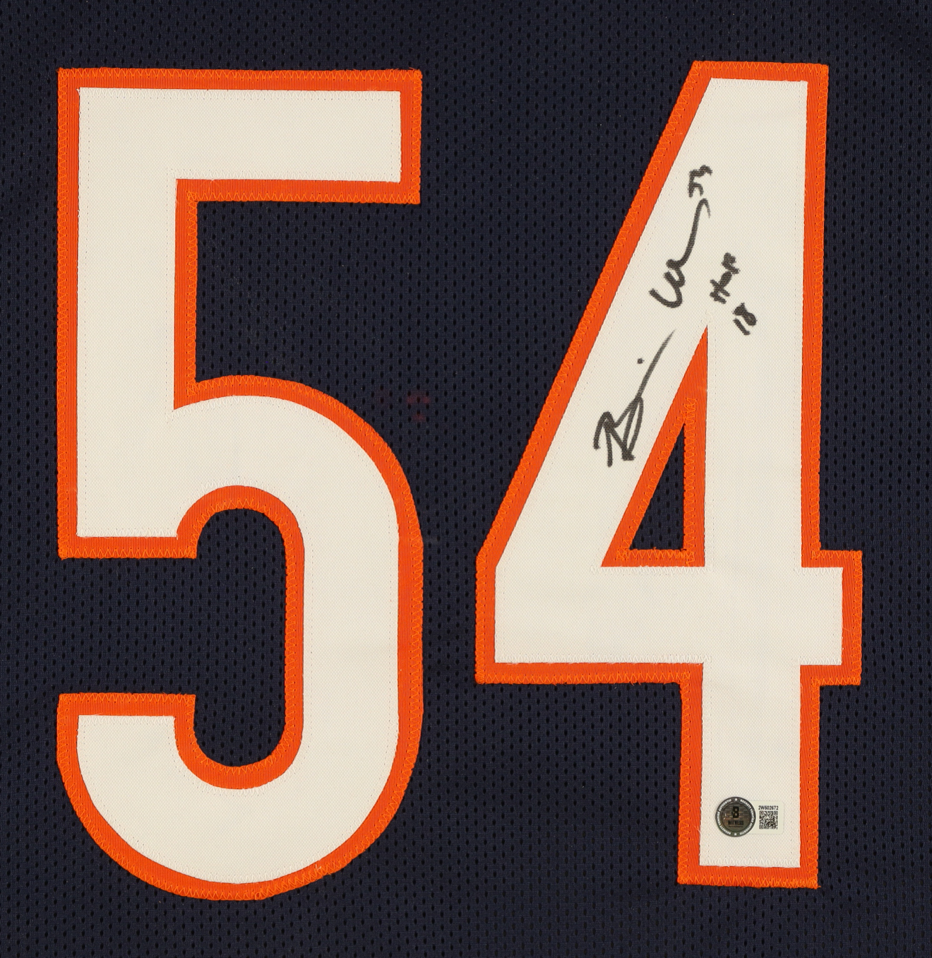 Custom frame measures 35" x 43" in size and features a jersey hand-signed and inscribed by Brian Urlacher (HOF).
