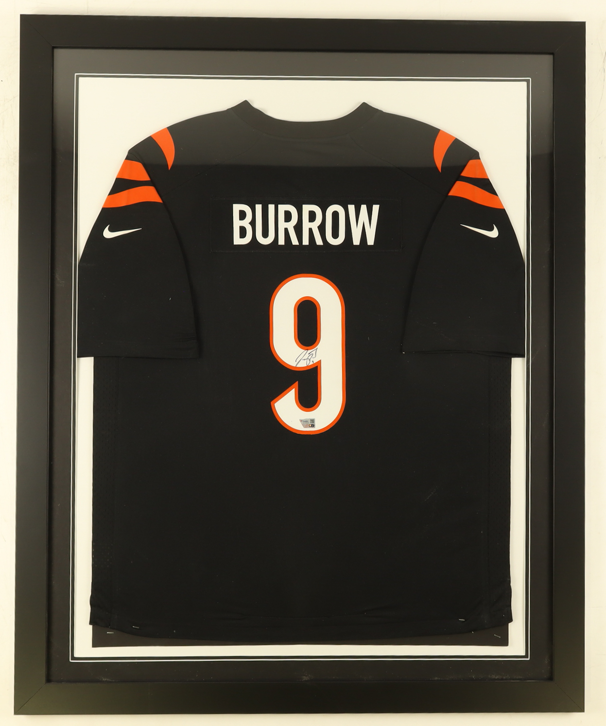 Custom frame measures 35" x 43" in size and features a Nike jersey hand-signed by Joe Burrow (Cincinnati Bengals).