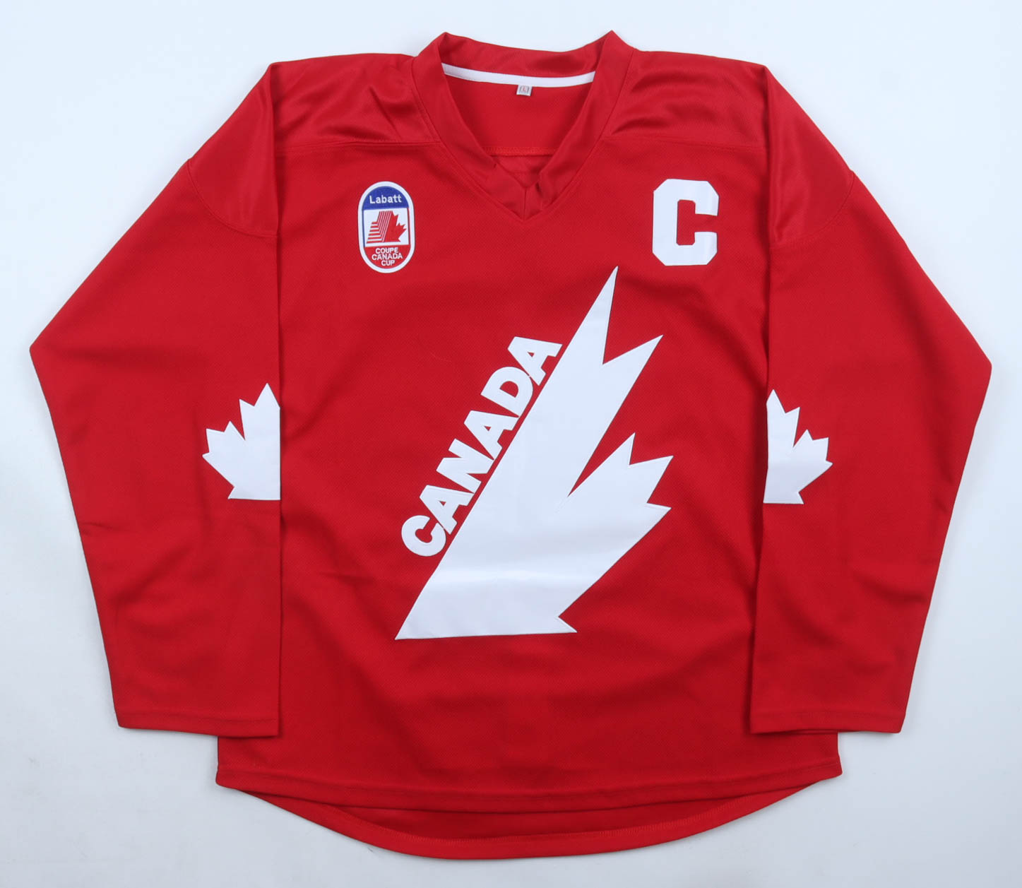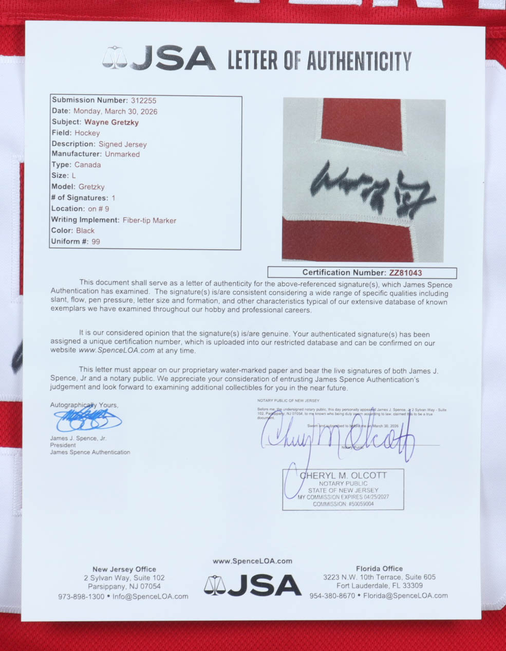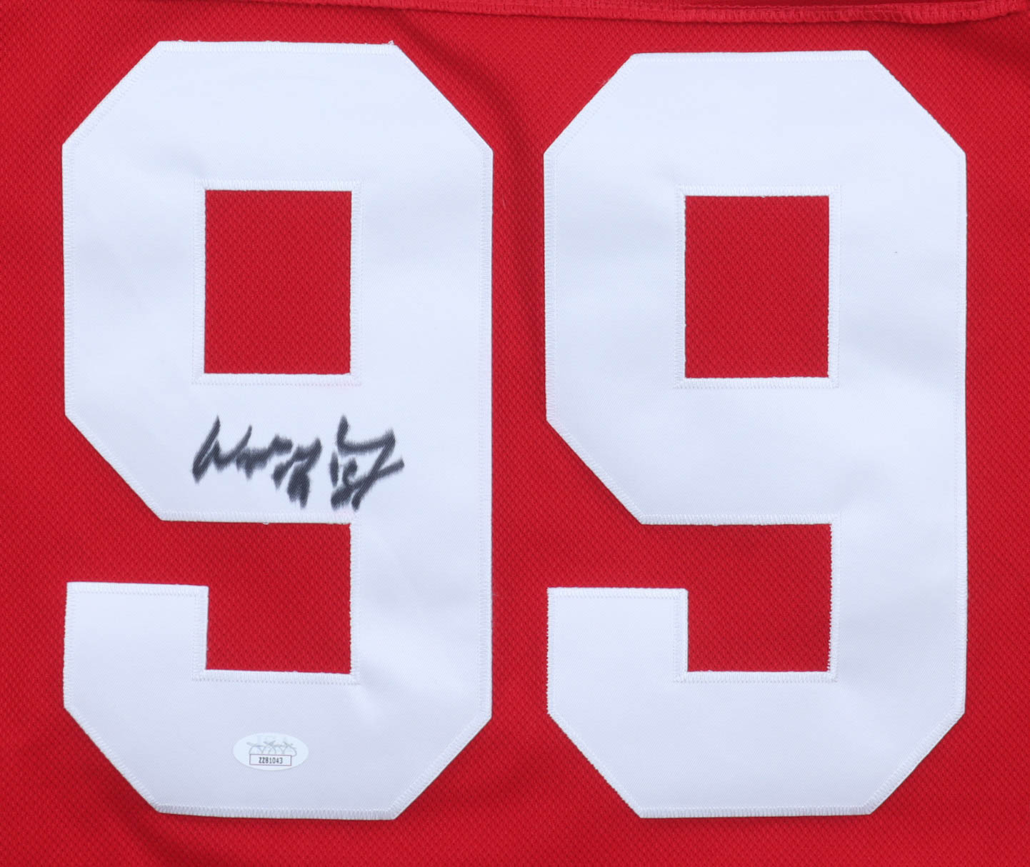 Custom jersey with everything sewn, size L. Jersey has been hand-signed by hockey icon, Wayne Gretzky (HOF). Please note, the signature has bled.